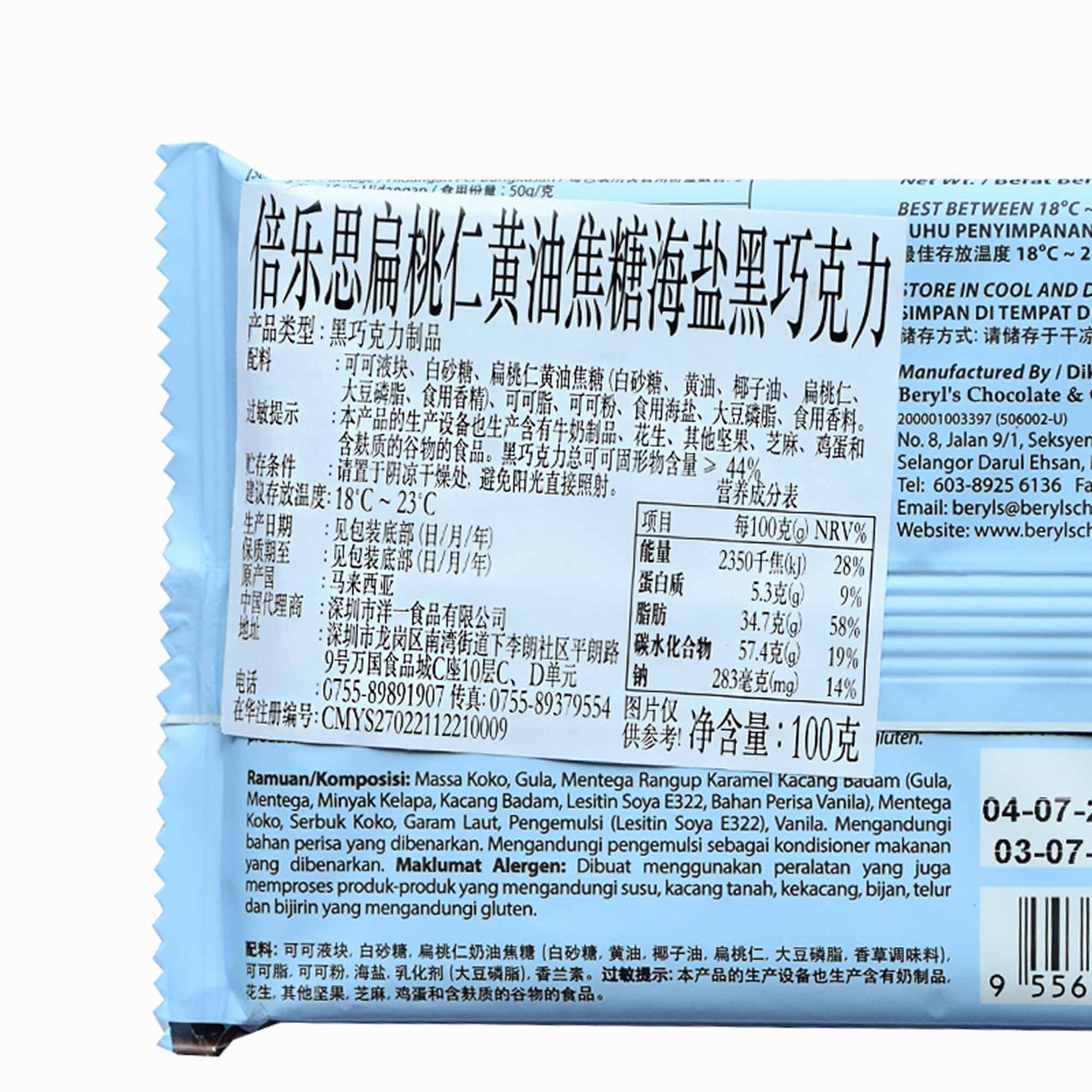 马来西亚原装进口零食Beryls倍乐思扁桃仁黄油焦糖海盐黑巧克力块