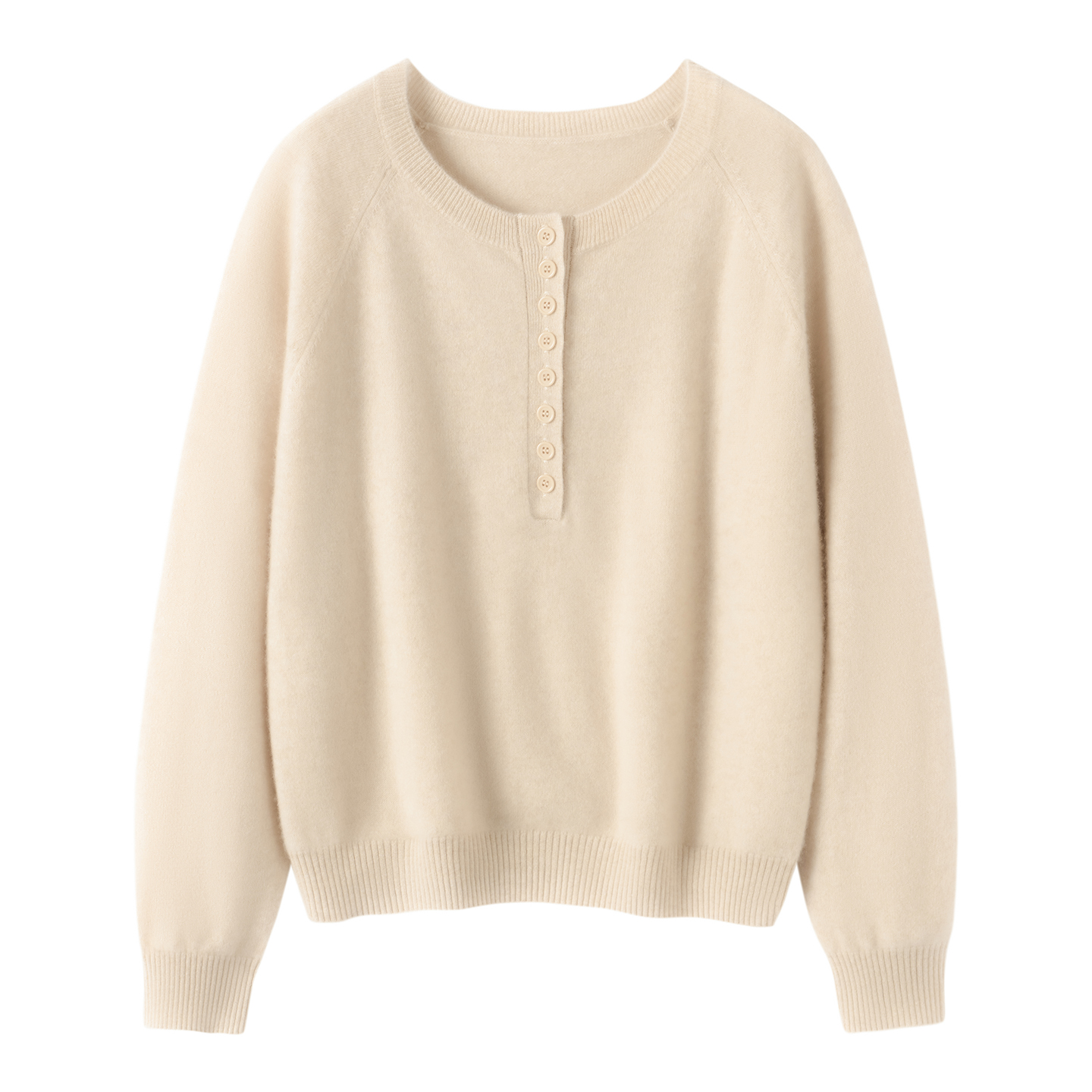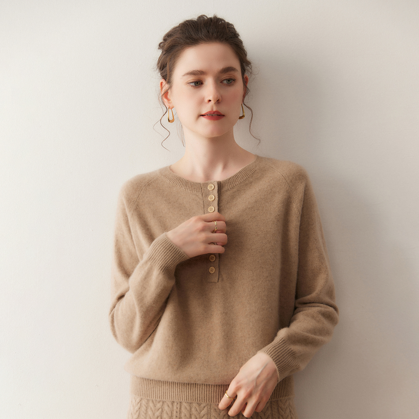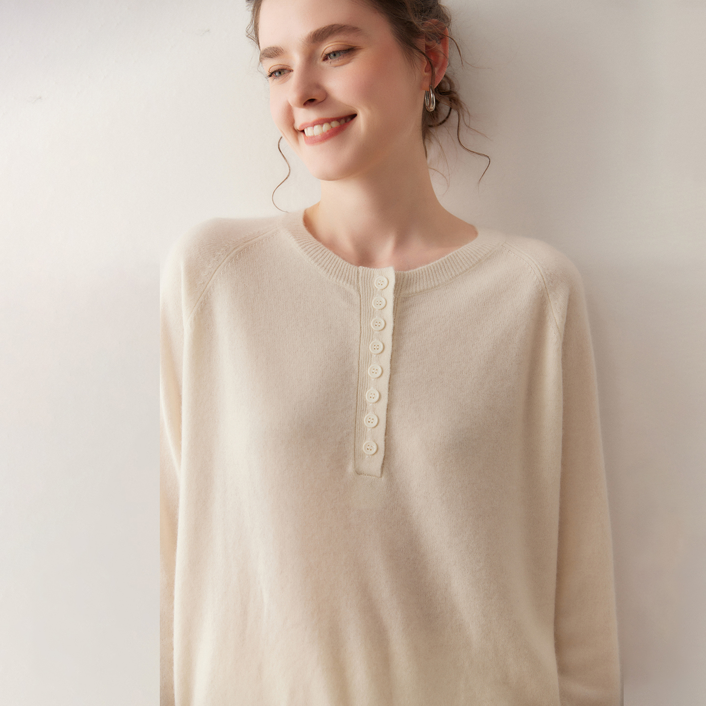 红莲高端山羊绒衫女圆领半开扣针织衫宽松显瘦纯色针织打底衫毛衣