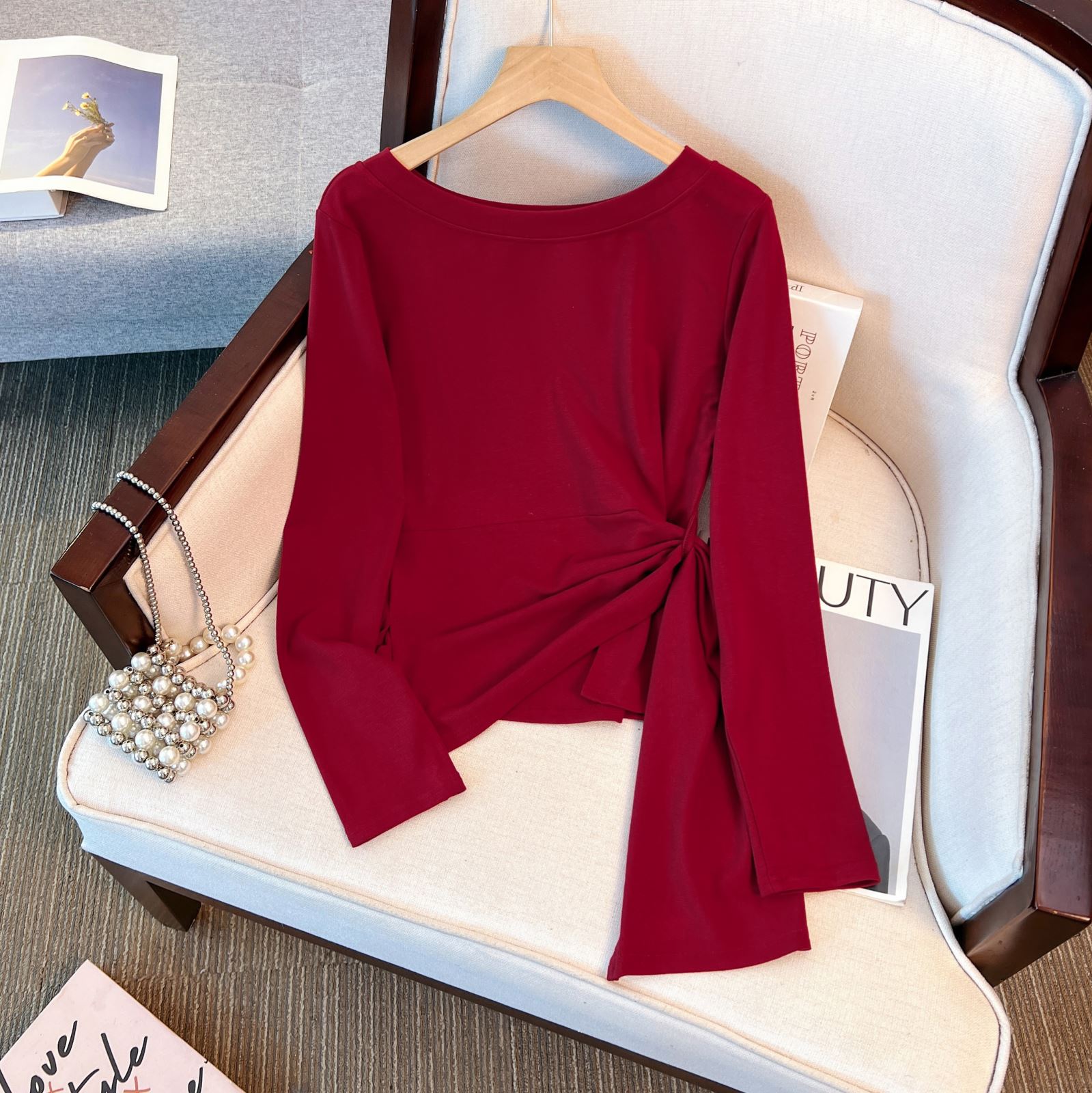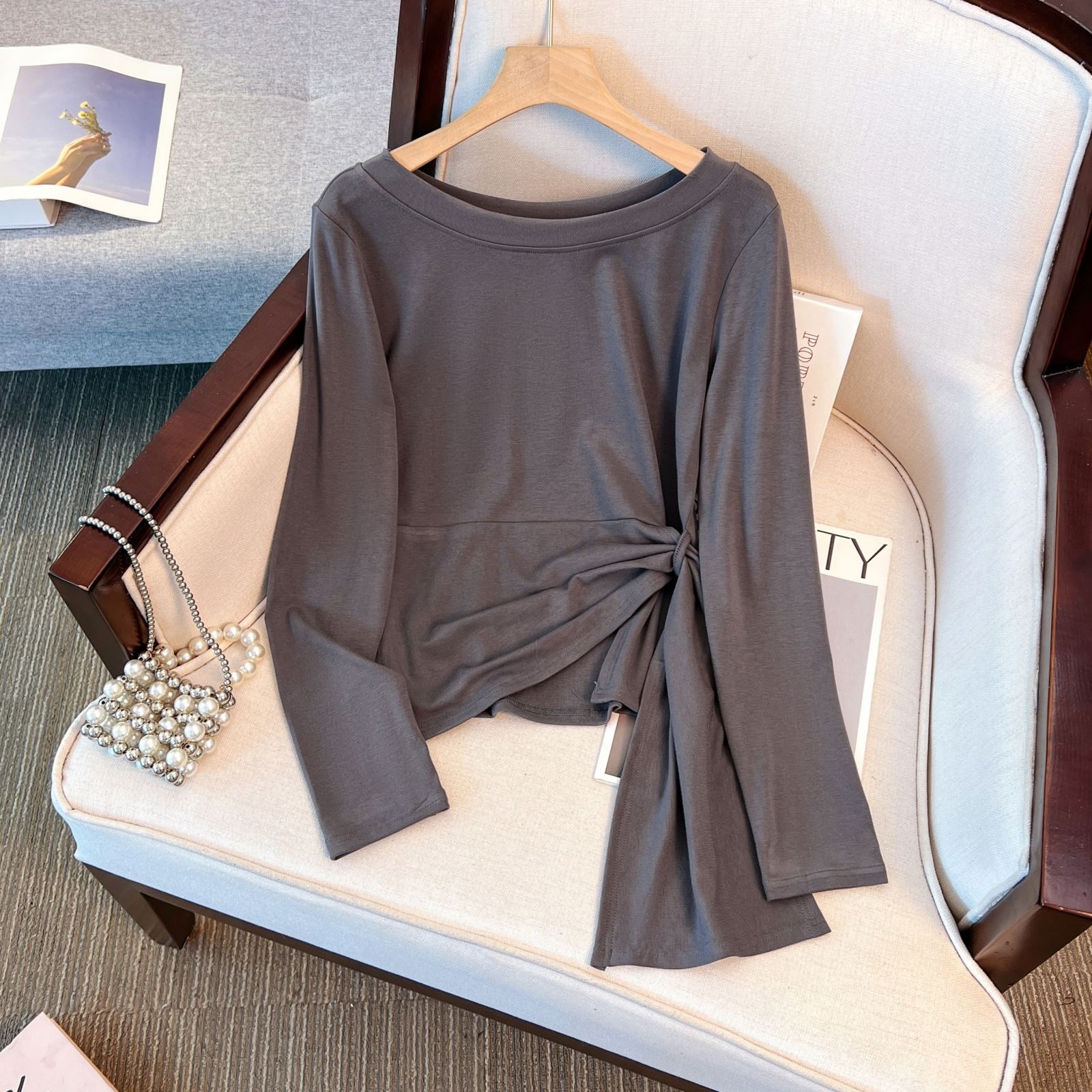 大码胖mm韩系条纹不规则开叉斜肩长袖T恤女装早秋收腰设计感上衣