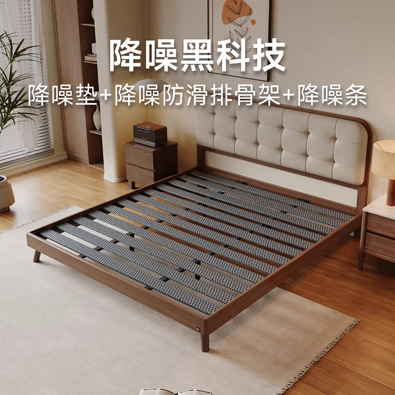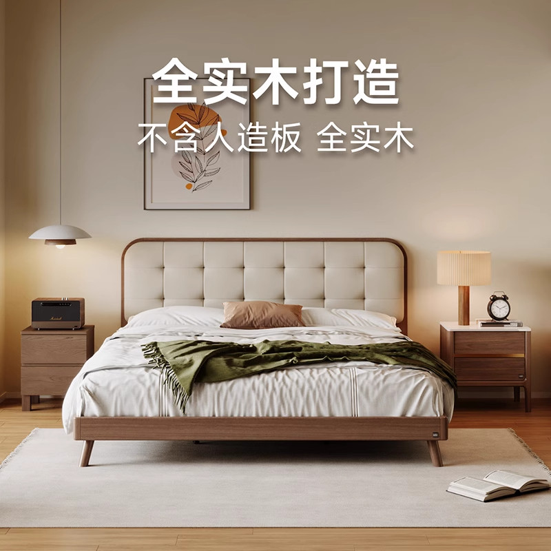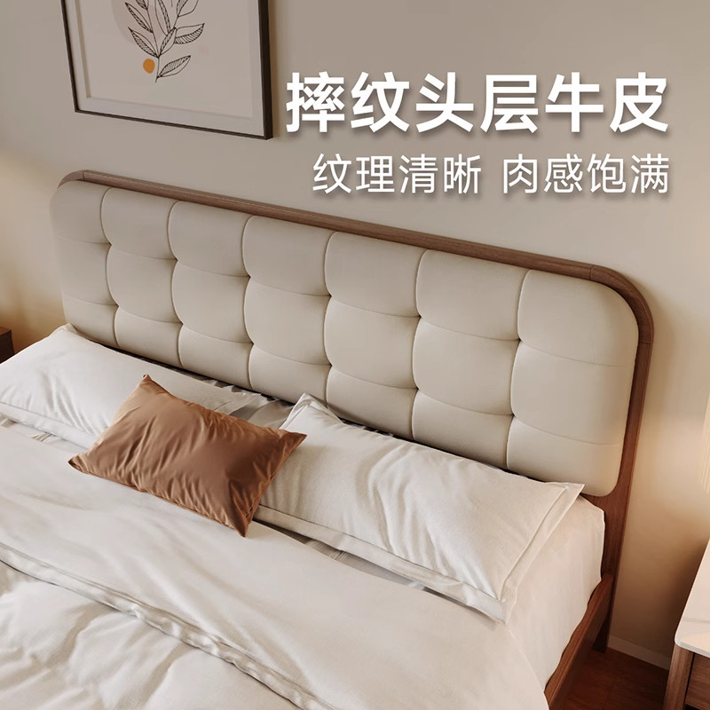 顾家家居实木床中古风胡桃木全实木床头层牛皮软包小户型双人床