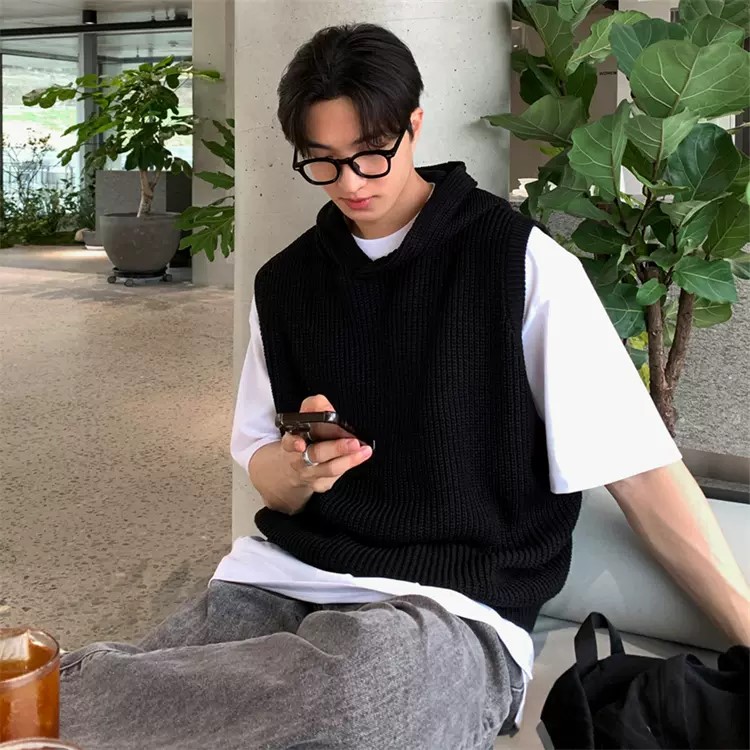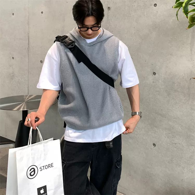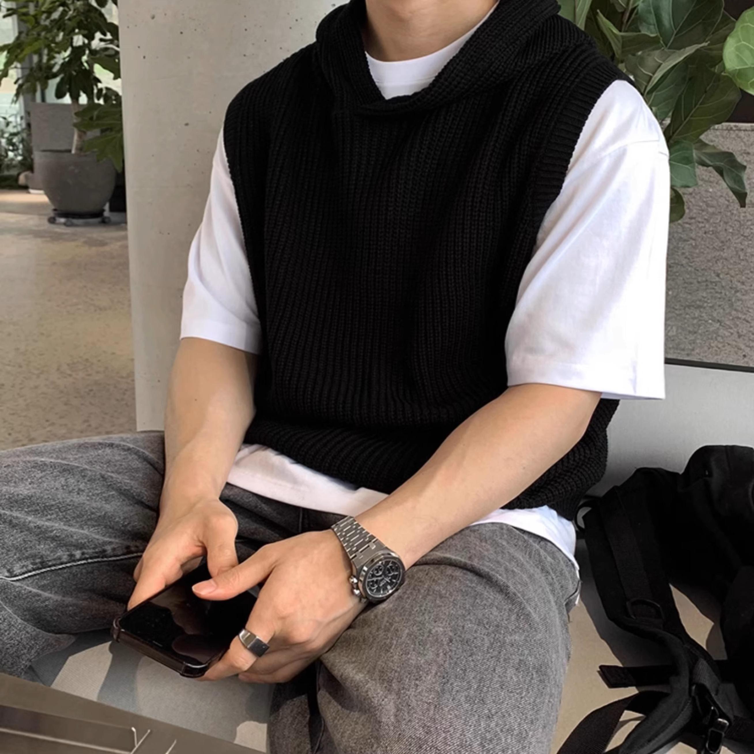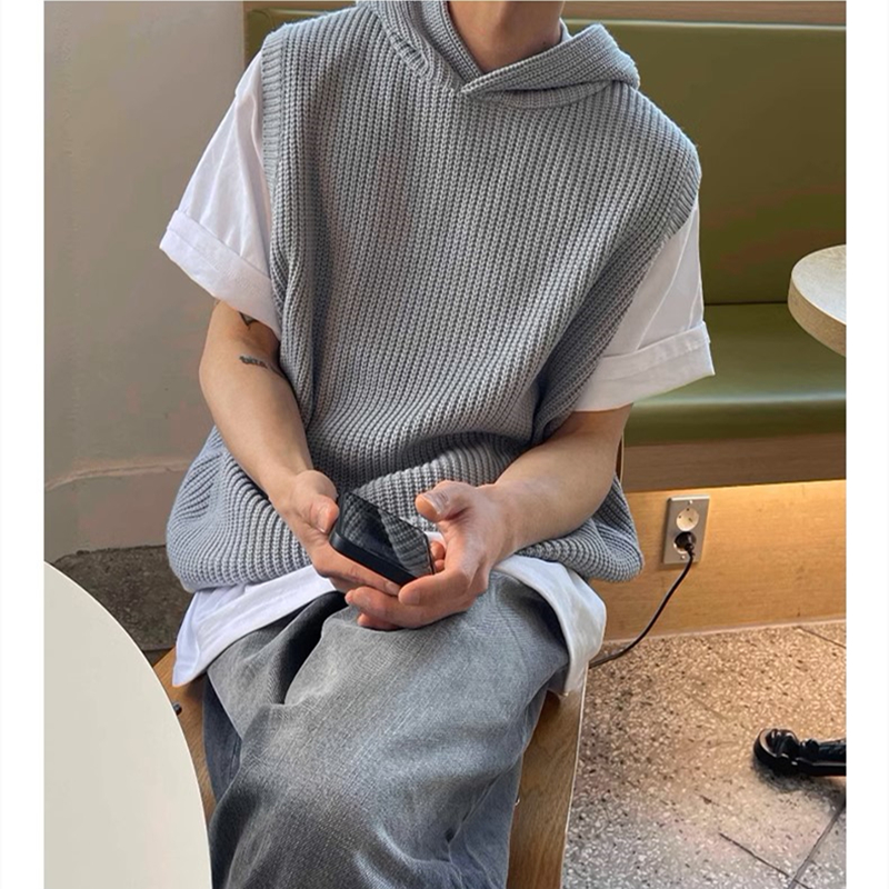 韩版宽松带帽无袖毛衣男生极简风纯色针织衫马甲毛线背心上衣外套