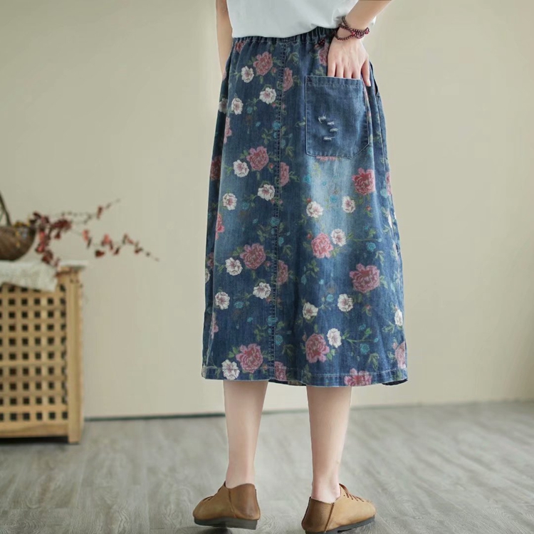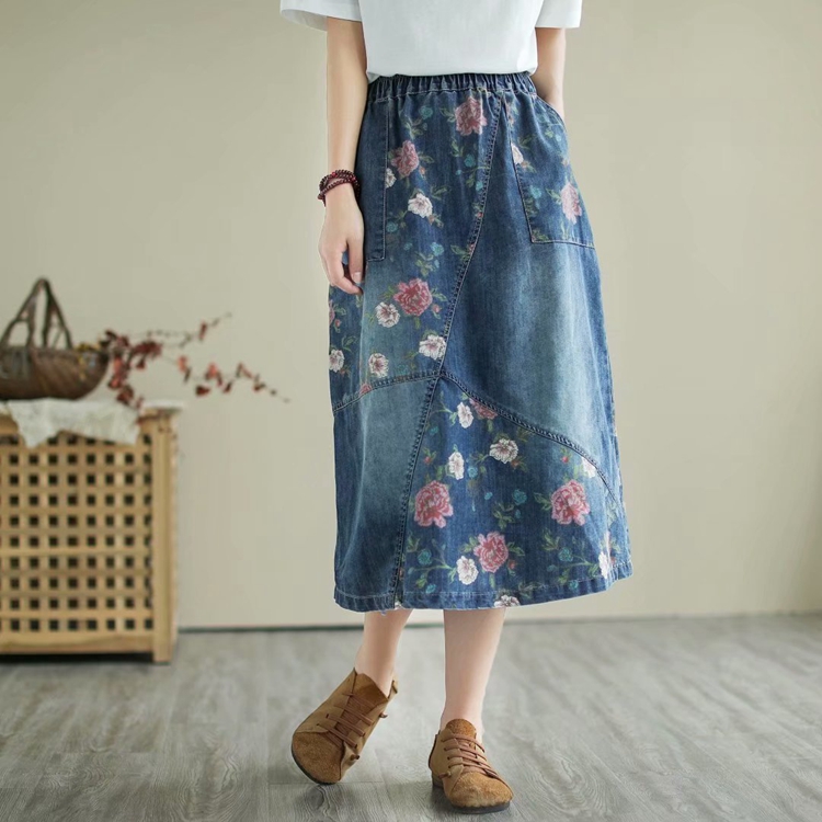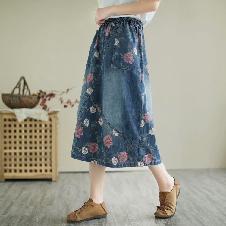 外贸女装2021夏季新款复古拼接宽松牛仔半身裙女松紧腰显瘦A字裙