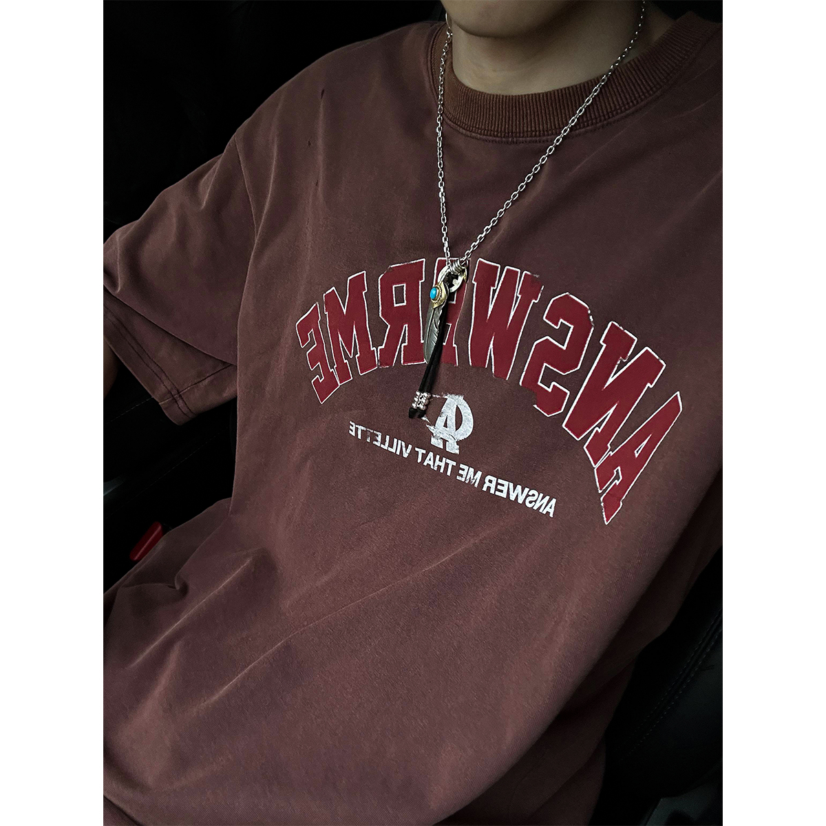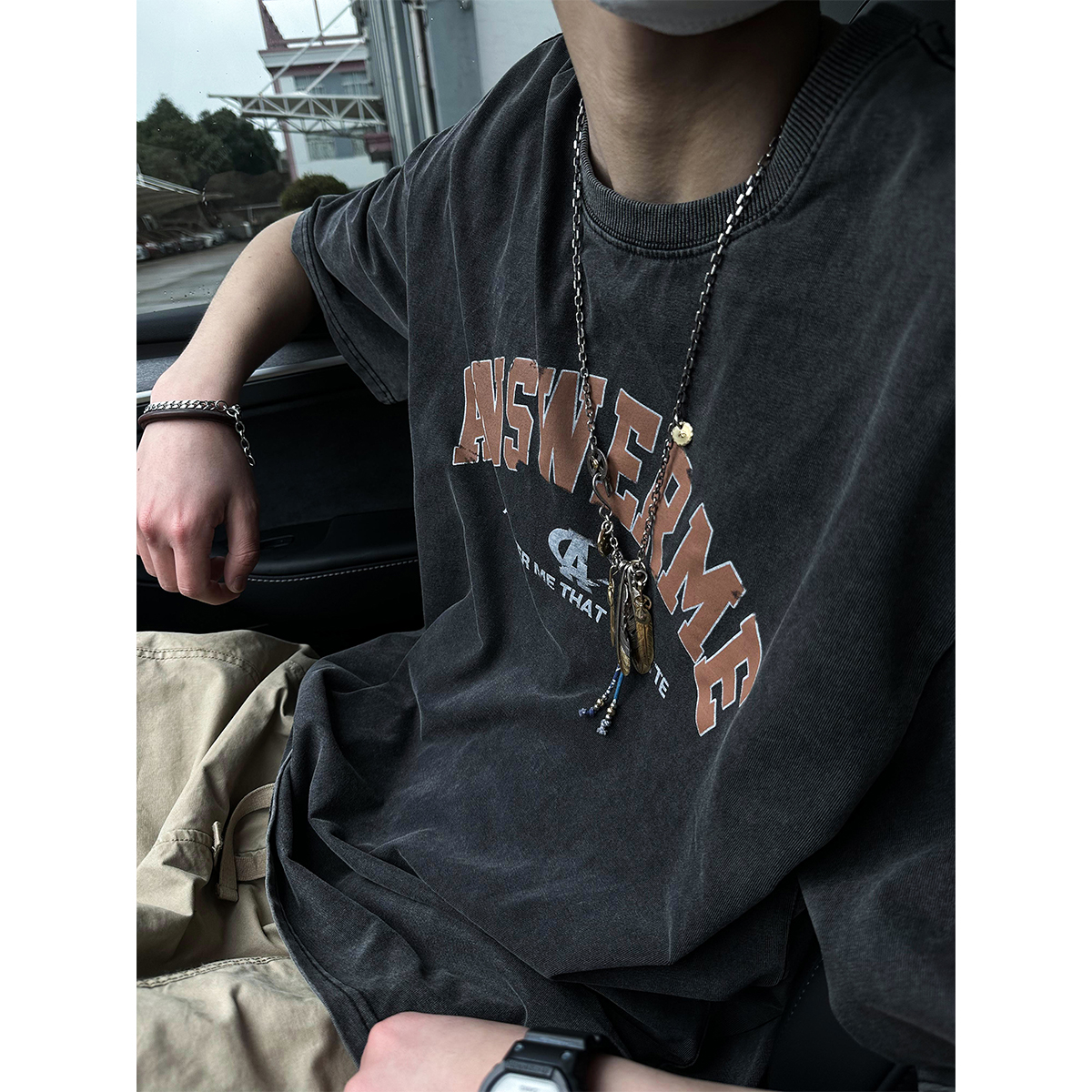 MANCHER美式复古炒色洗水字母做旧印花短袖T恤男通勤夏季宽松半袖