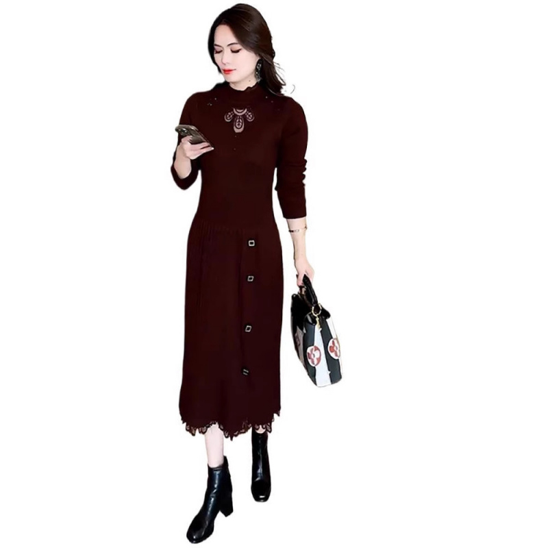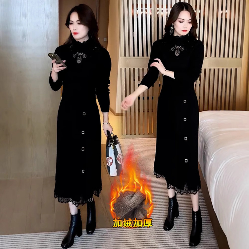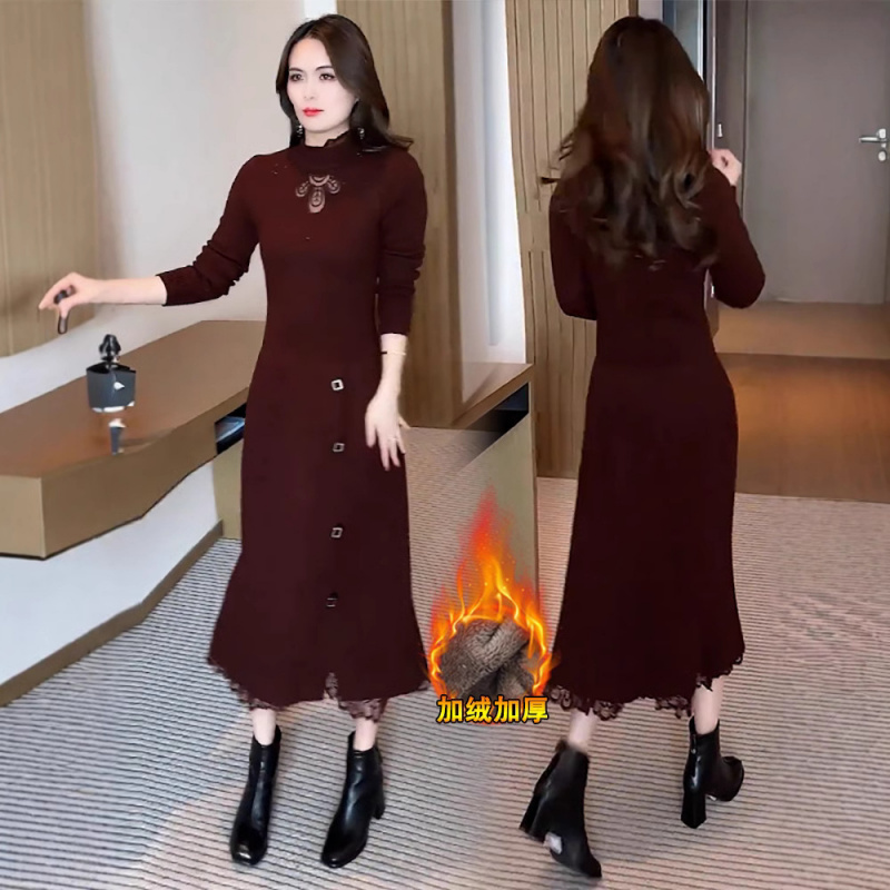 2025冬季新款加绒加厚长款针织连衣裙女时尚洋气配大衣打底毛衣裙