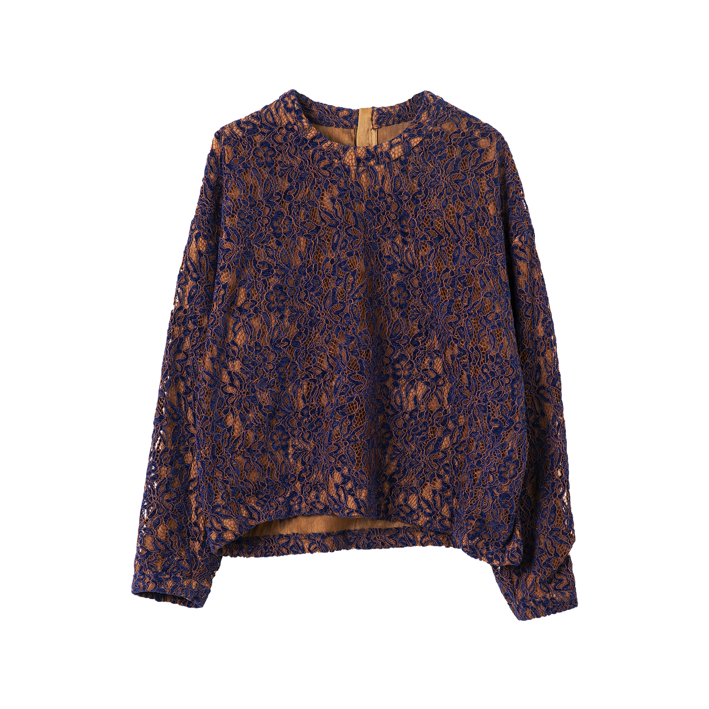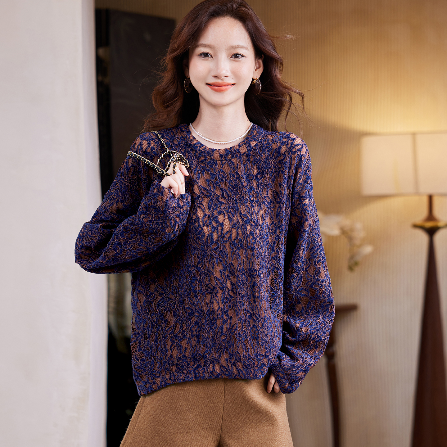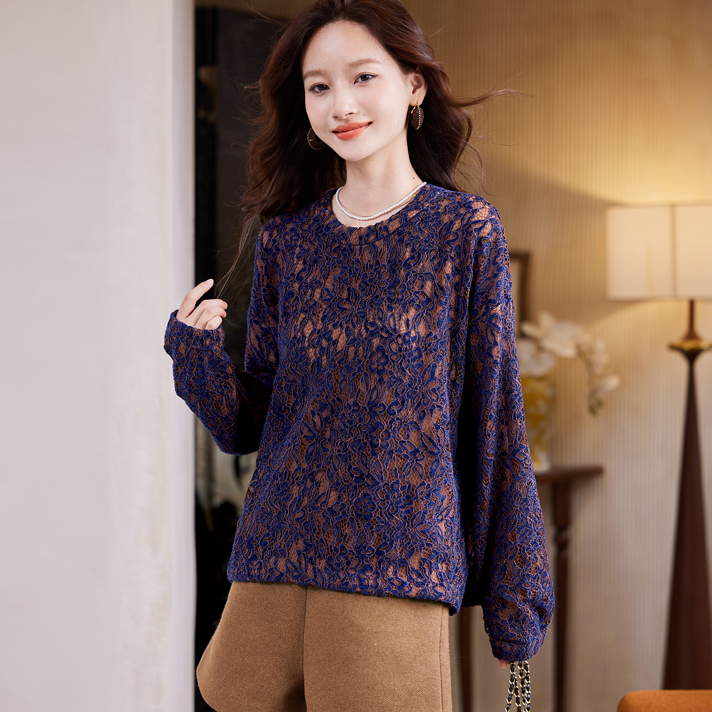 宝诗黎圆领蕾丝长袖上衣2025秋冬新款洋气休闲宽松百搭时尚女装