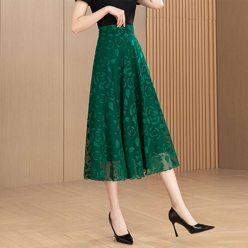 夏季雪纺绿色提花半身裙中长款2025新款高腰a字大码小个子大摆裙