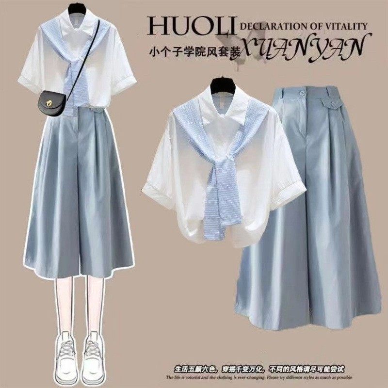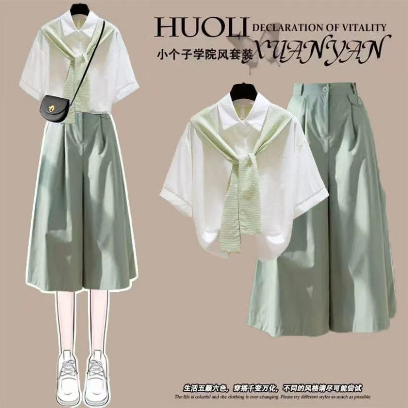 女学生套装2025夏季韩版宽松学院风短袖衬衫+高腰阔腿裤裙两件套