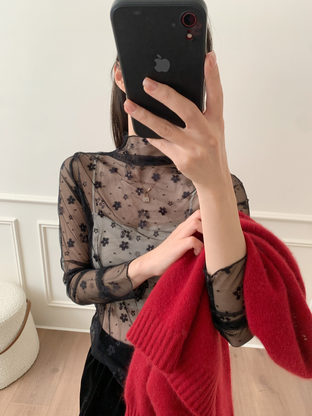 秋上新!Bo家韩国 仙女气质美翻了 蕾丝小花刺绣半高领打底衫上衣