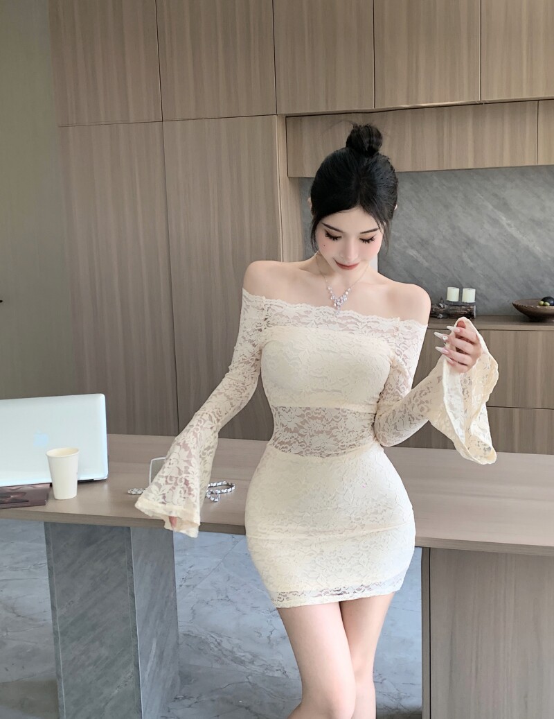 辣妹百搭一字领露肩性感长袖连衣裙蕾丝镂空设计喇叭袖包臀短裙女