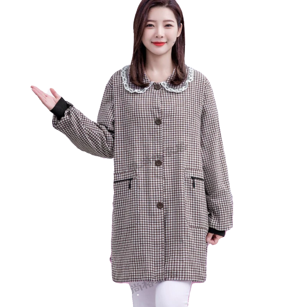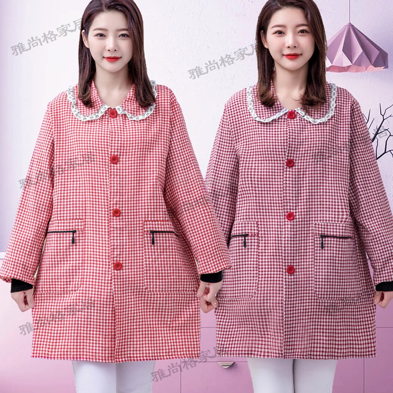 新款棉布宽松罩衣长袖围裙纽扣无帽防污上班干活厨房家用格子工作