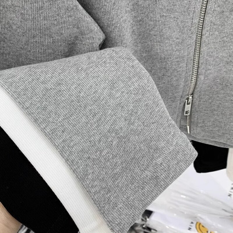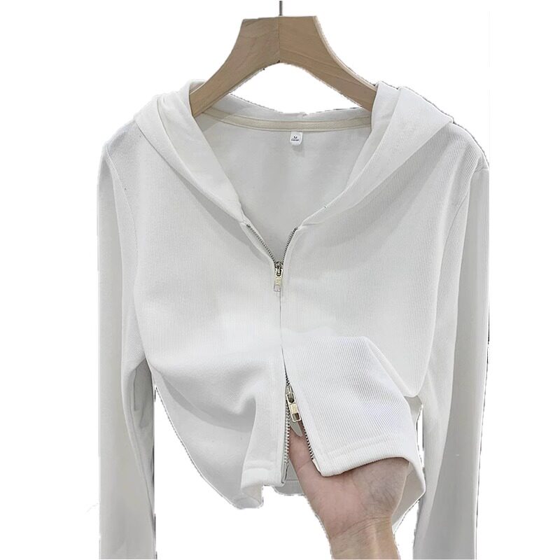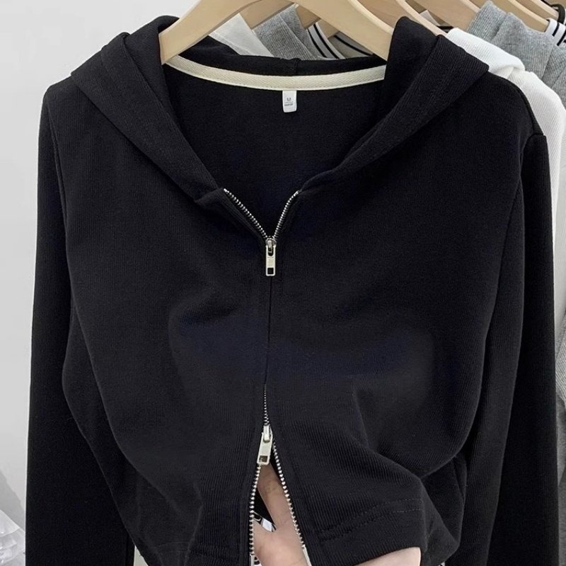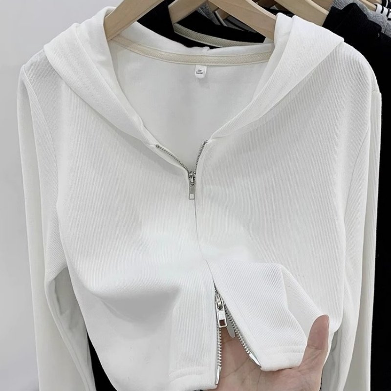 短款灰色卫衣外套女2025年春秋新款双拉链设计感连帽针织上衣开衫