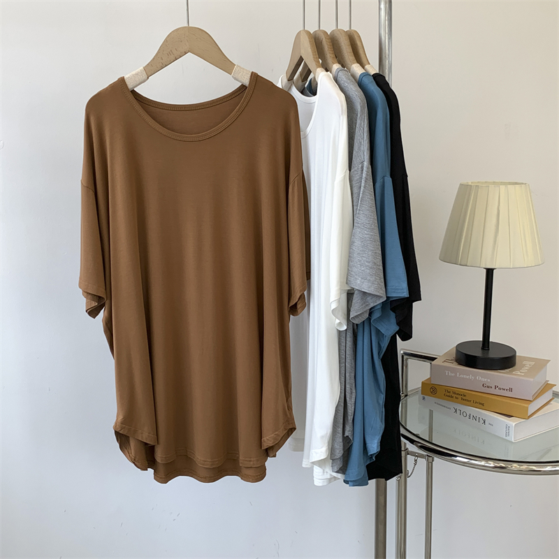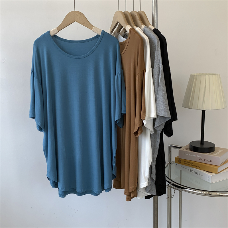 莫代尔蓝绿色短袖T恤女宽松大码纯色街头风舞蹈服T恤木代尔上衣女