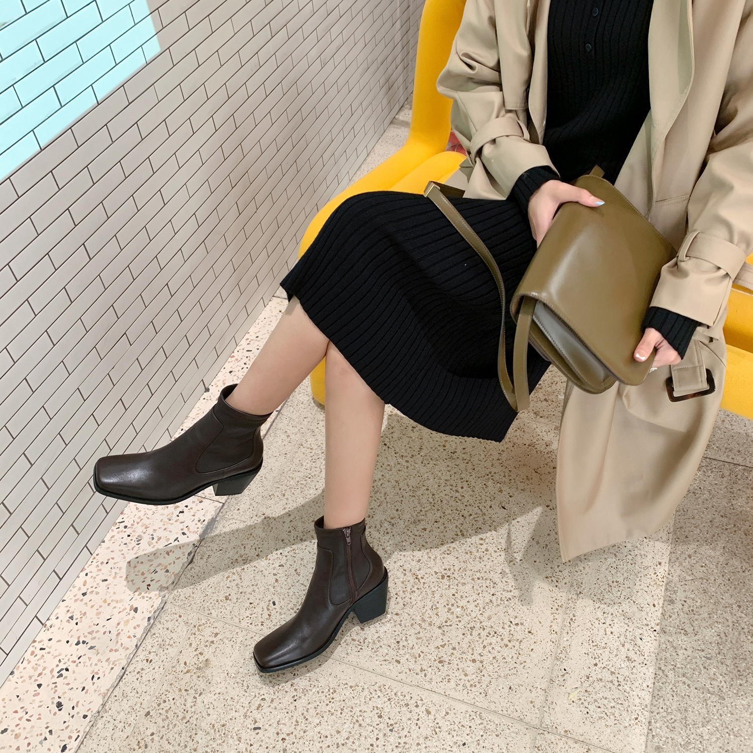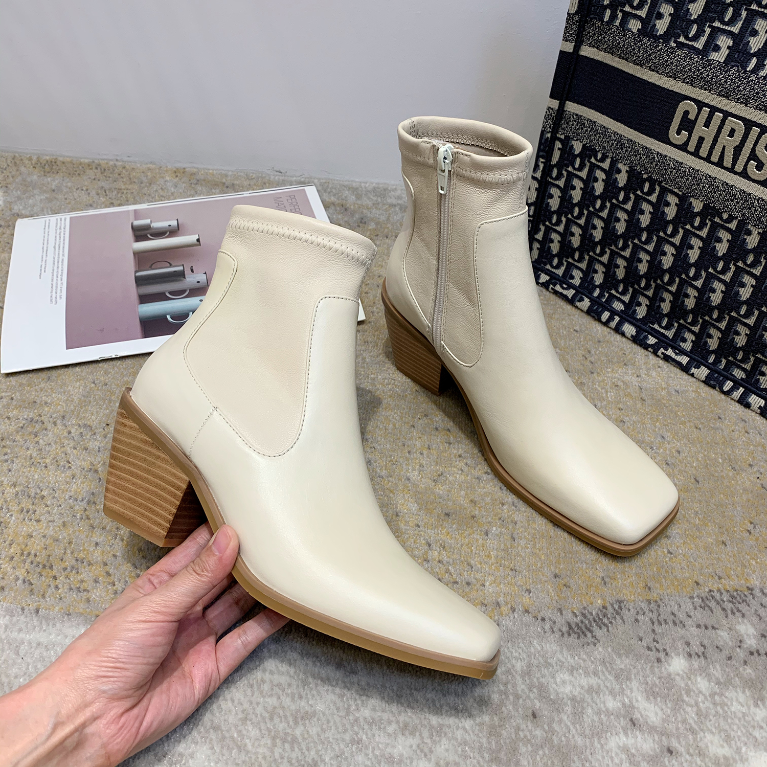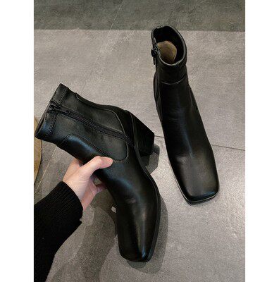 InkingPot彭姐 暗黑复古风方头粗跟高跟短靴弹力羊皮包脚踝瘦瘦靴