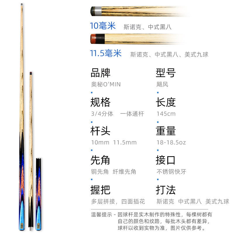 Omin奥秘飓风台球杆通杆中式黑八黑8中头11.5mm桌球杆台球球杆