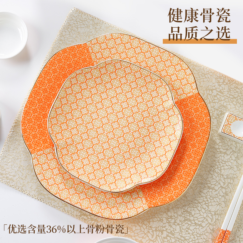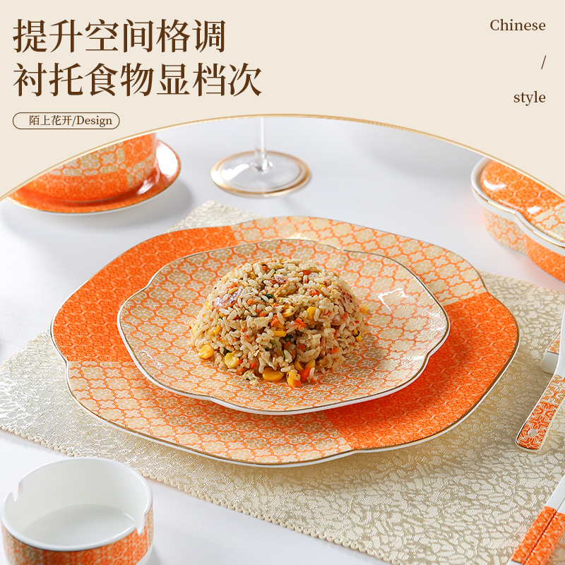 新款中式复古纹理摆台餐具酒店骨瓷碗盘碟家用金边西餐厅盘子套装