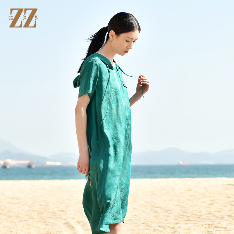 佐尔美夏季新款 时尚气质连帽桑蚕丝真丝短袖连衣裙女E32LS15