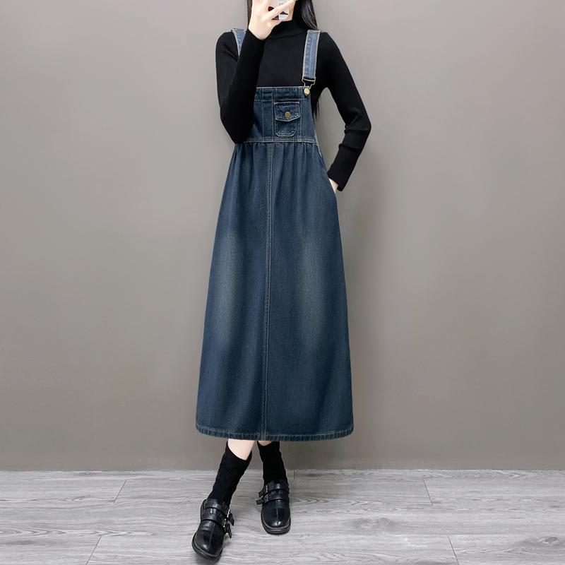 加大码复古开叉牛仔背带裙秋2025宽松高腰显瘦减龄长款吊带连衣裙