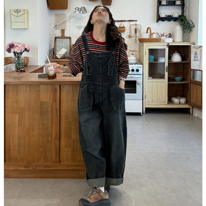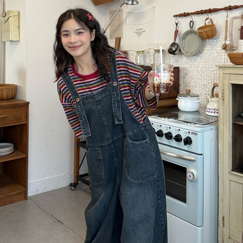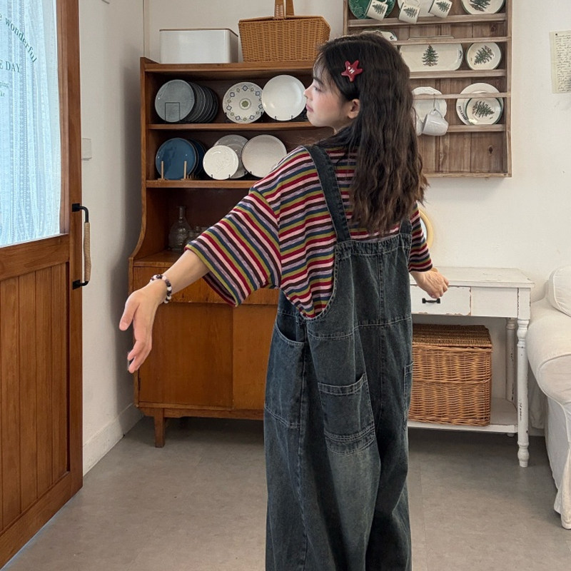 彩虹条纹T恤+休闲牛仔背带裤套装