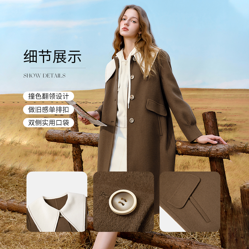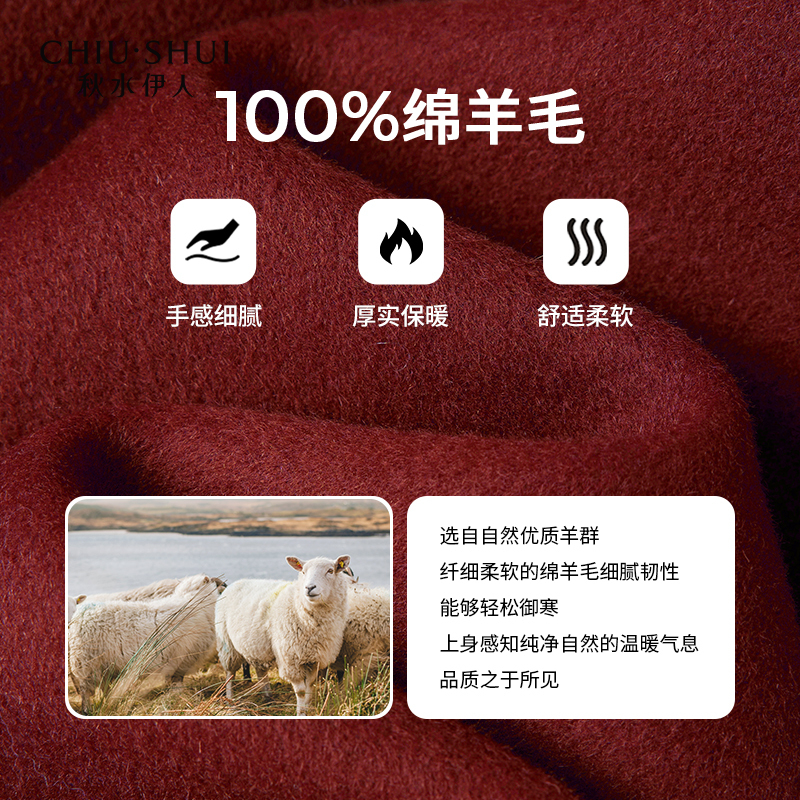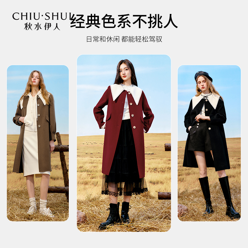 秋水伊人甜美翻领双面毛呢外套2023年冬季新款女全羊毛中长款大衣