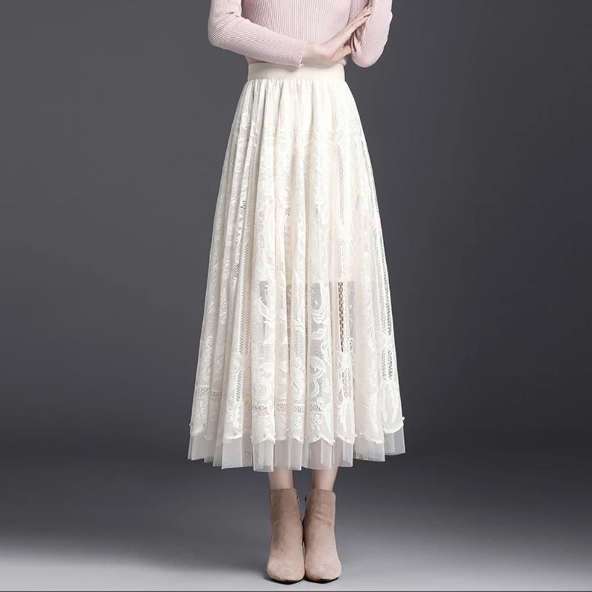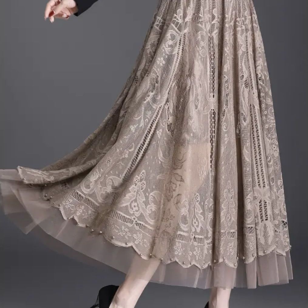 蕾丝半身裙高档垂坠感洋气高端镂空高腰遮肉大摆裙a字裙长裙