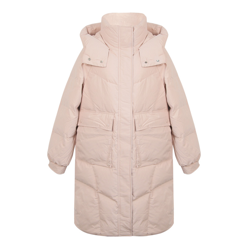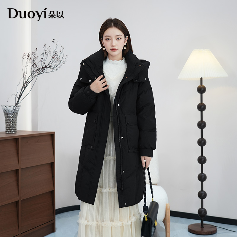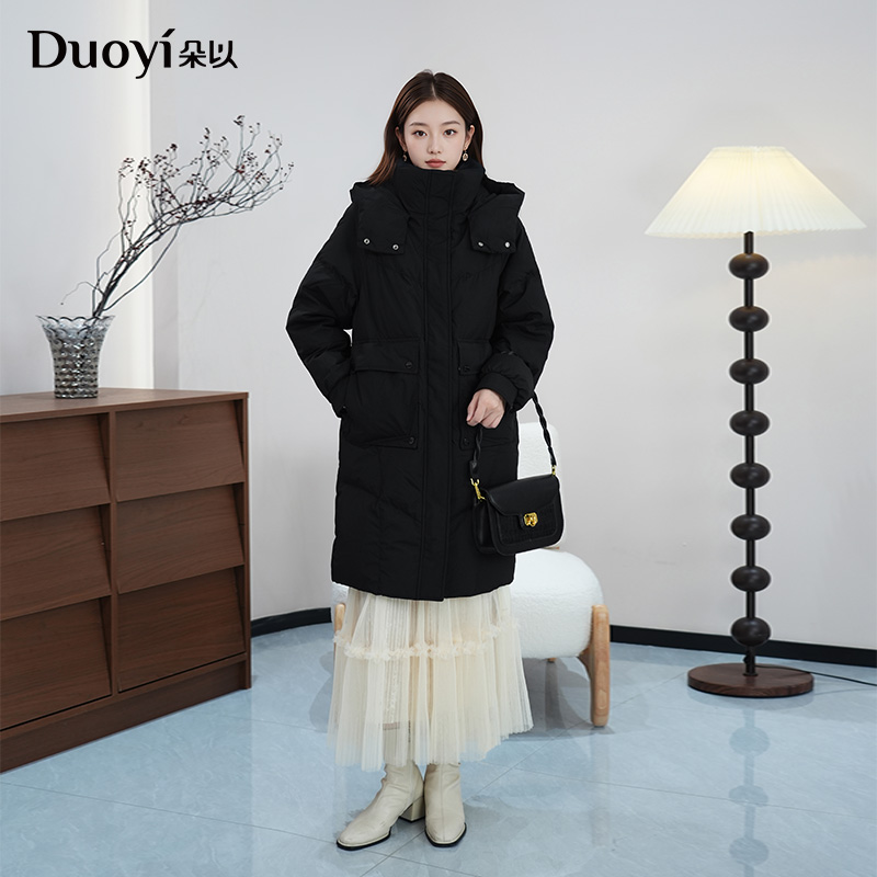 朵以2025冬季新款休闲时尚多口袋鸭绒中长款连帽羽绒服保暖外套