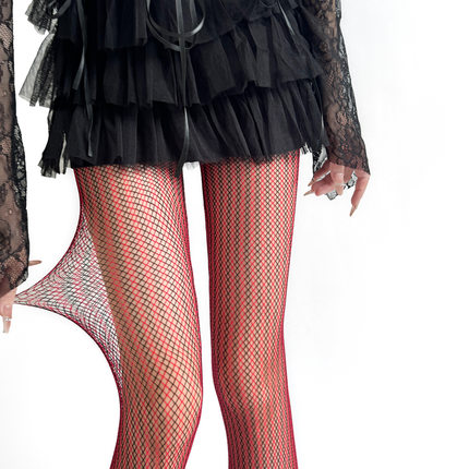 红色拼色竖纹渔网高弹连裤袜