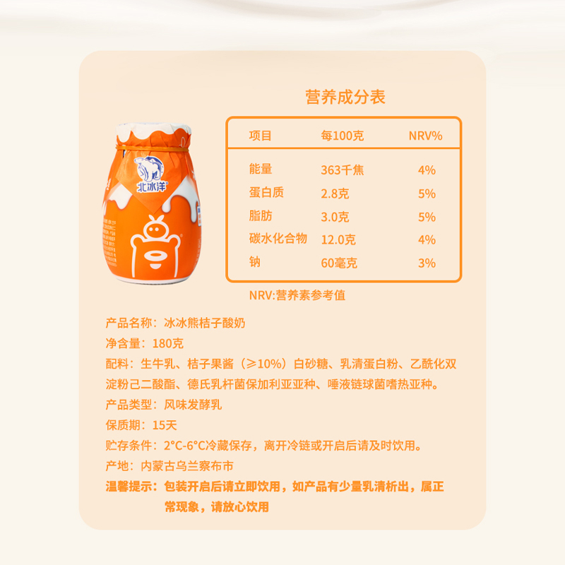 北冰洋瓷罐酸奶桔子味180g冰冰熊风味发酵乳酸奶 橘子果酱≥10%