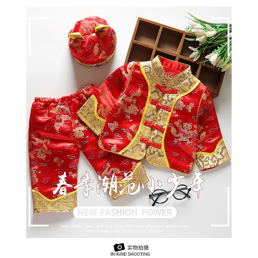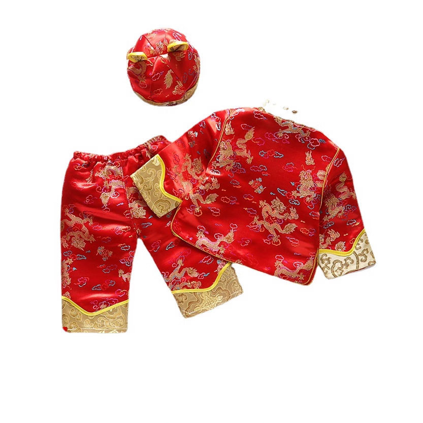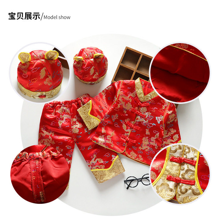 2020年春季新品宝宝提花织锦缎三件套百岁周岁礼服幼儿唐装三件套