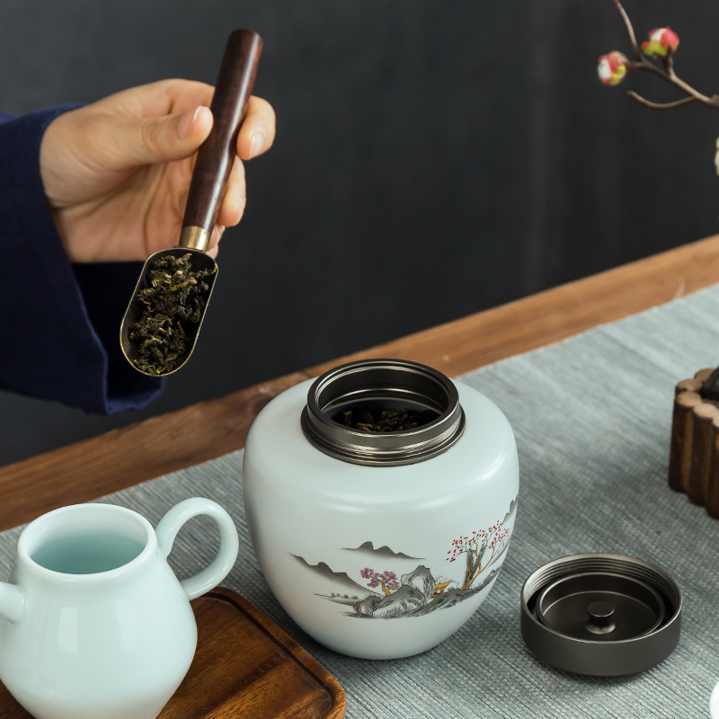 汝窑茶叶罐家用陶瓷密封罐茶罐小号茶叶包装盒茶仓防潮储存罐寒梅