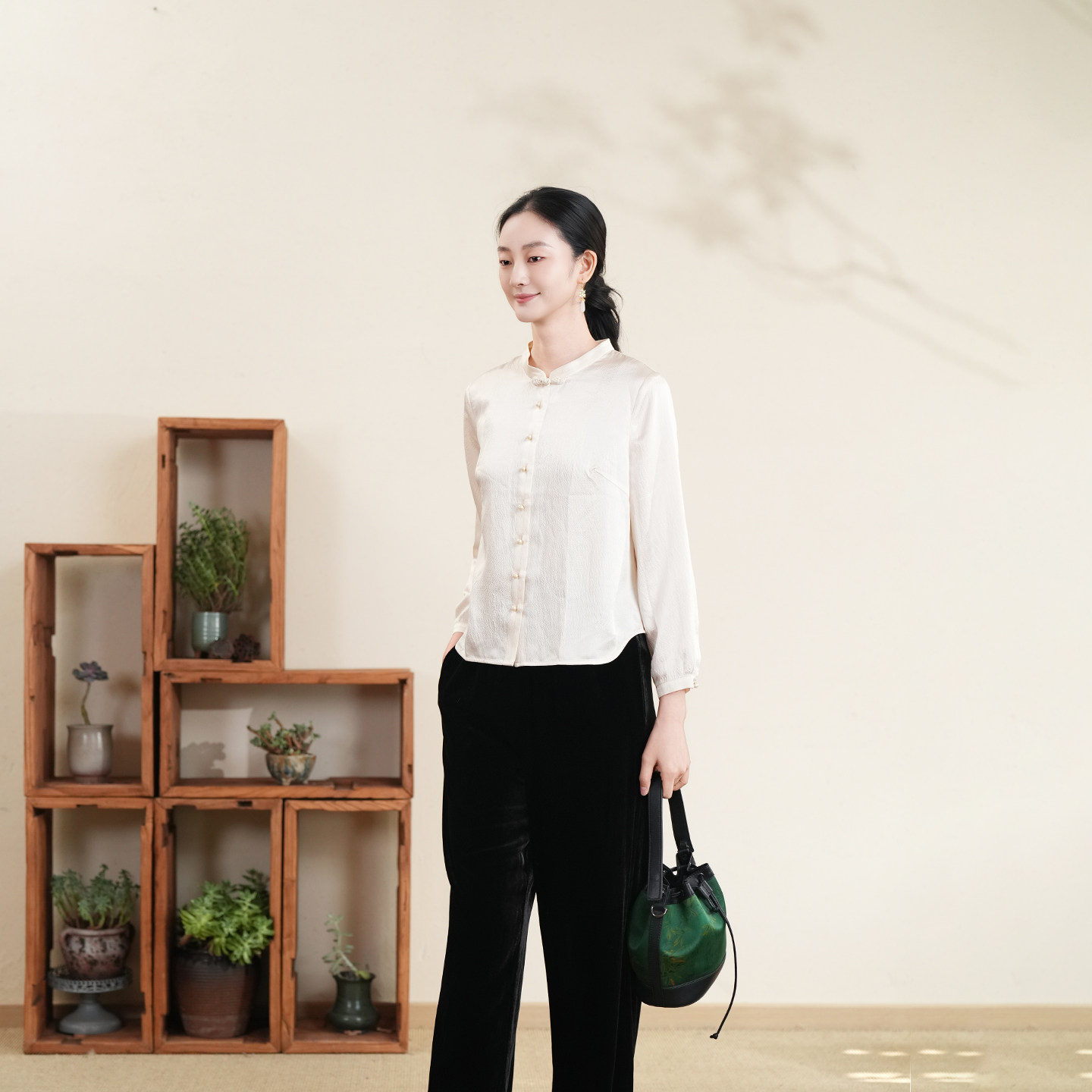 布符新中式「米杏真丝珍珠缎中式领衬衫」2026年春季新品长袖女装