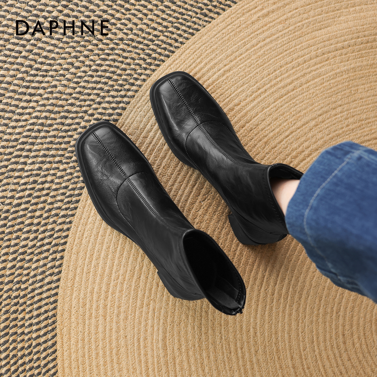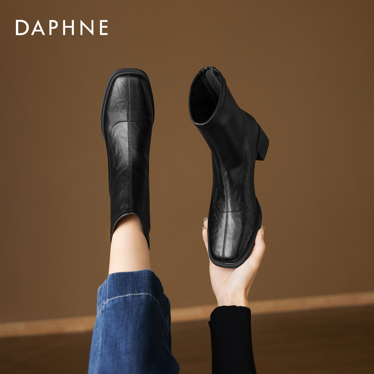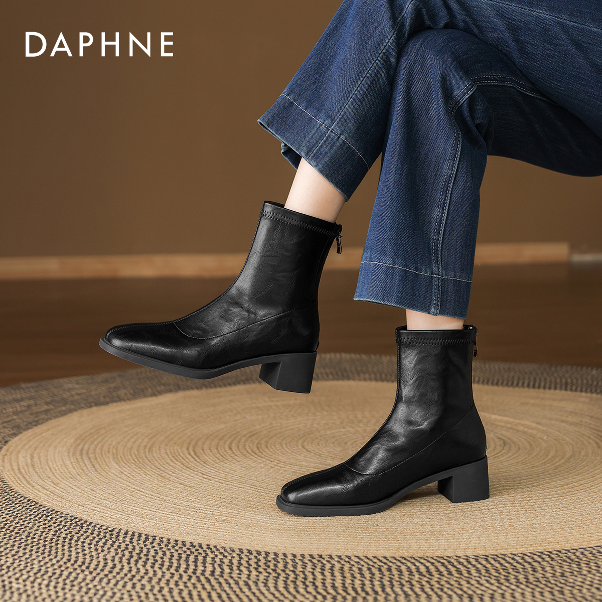 达芙妮黑色粗跟短靴英伦风瘦瘦靴