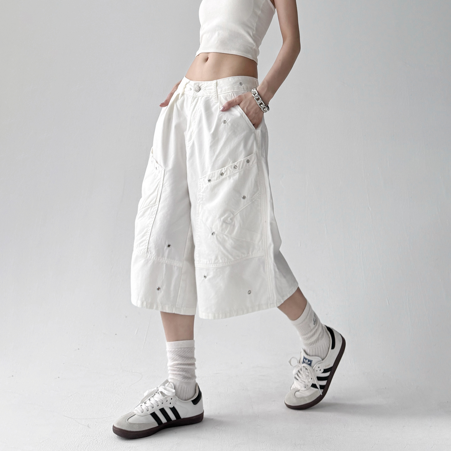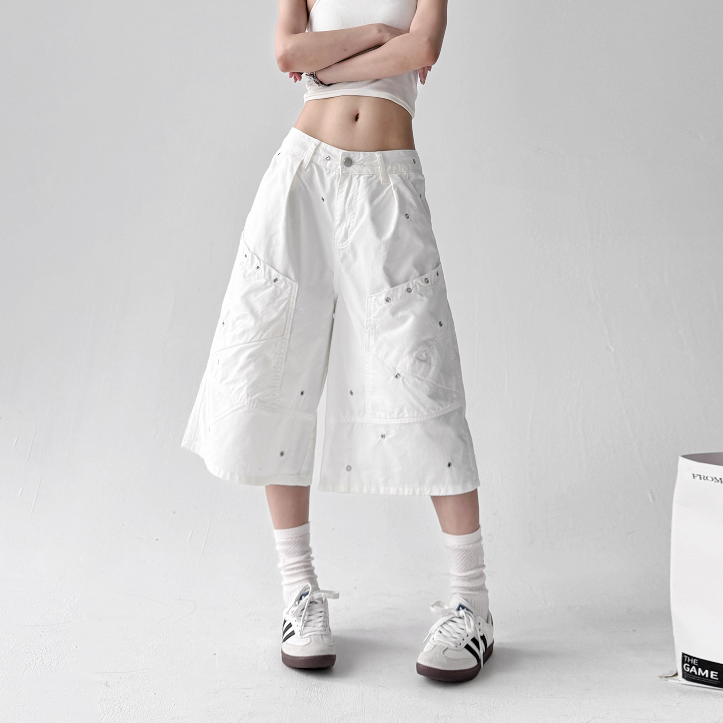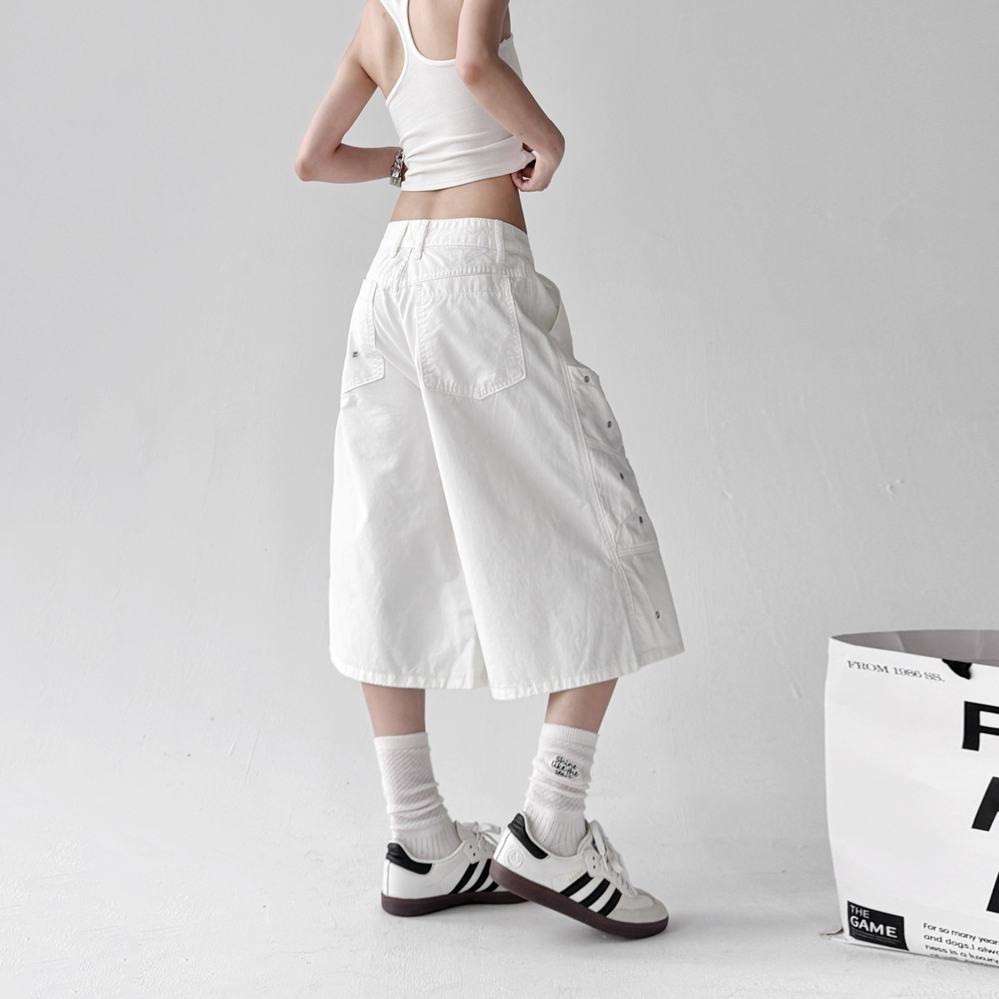 2025夏季新款美式复古泼墨工装裤女宽松高腰显瘦阔腿休闲七分裤子