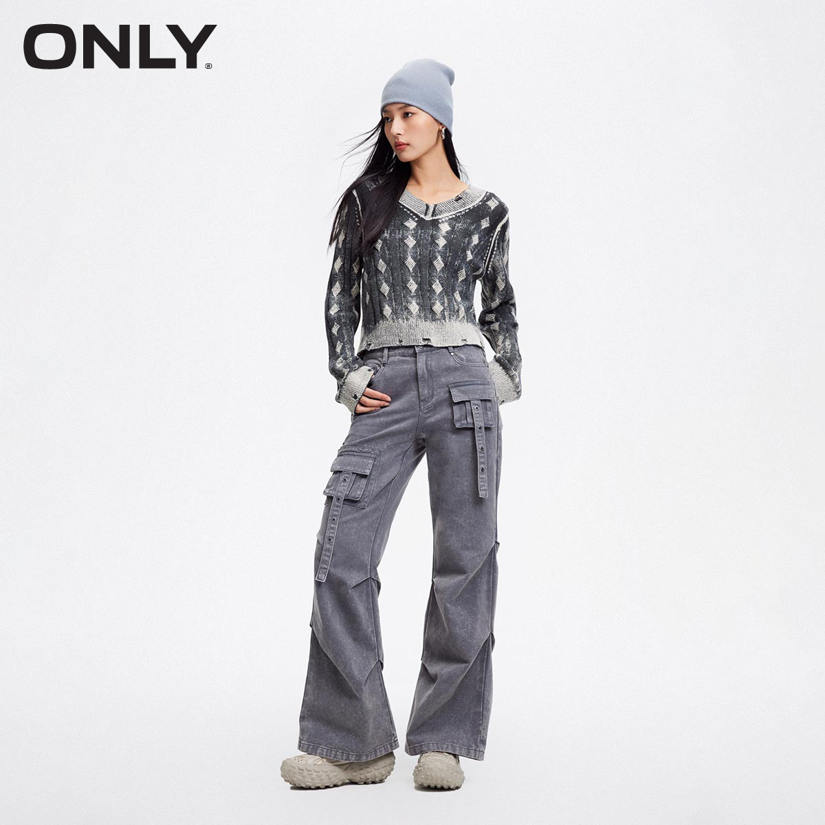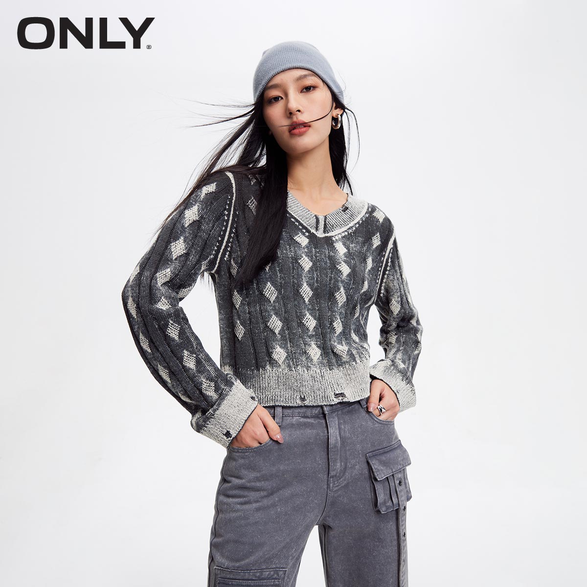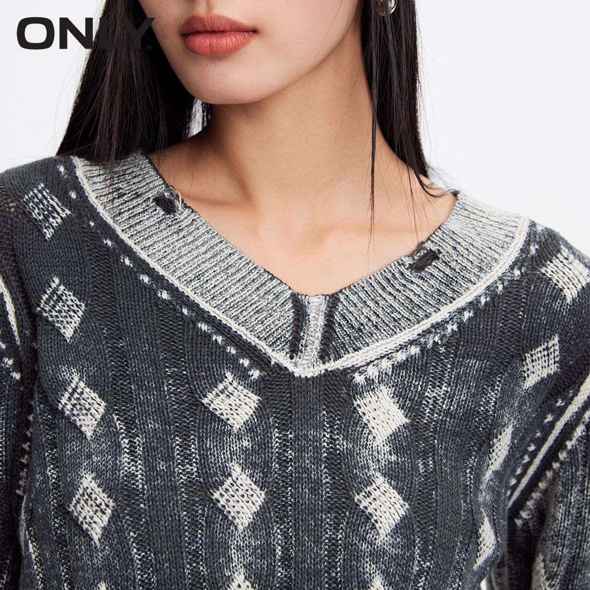 【ONLY奥莱】秋季设计感做旧绞花螺纹V领毛衣针织衫女