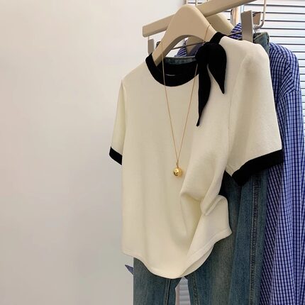 蝴蝶结系带冰丝针织短袖T恤女夏
