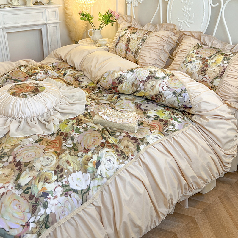 法式复古玫瑰全棉床上四件套公主风褶皱花边田园风被套纯棉床裙款
