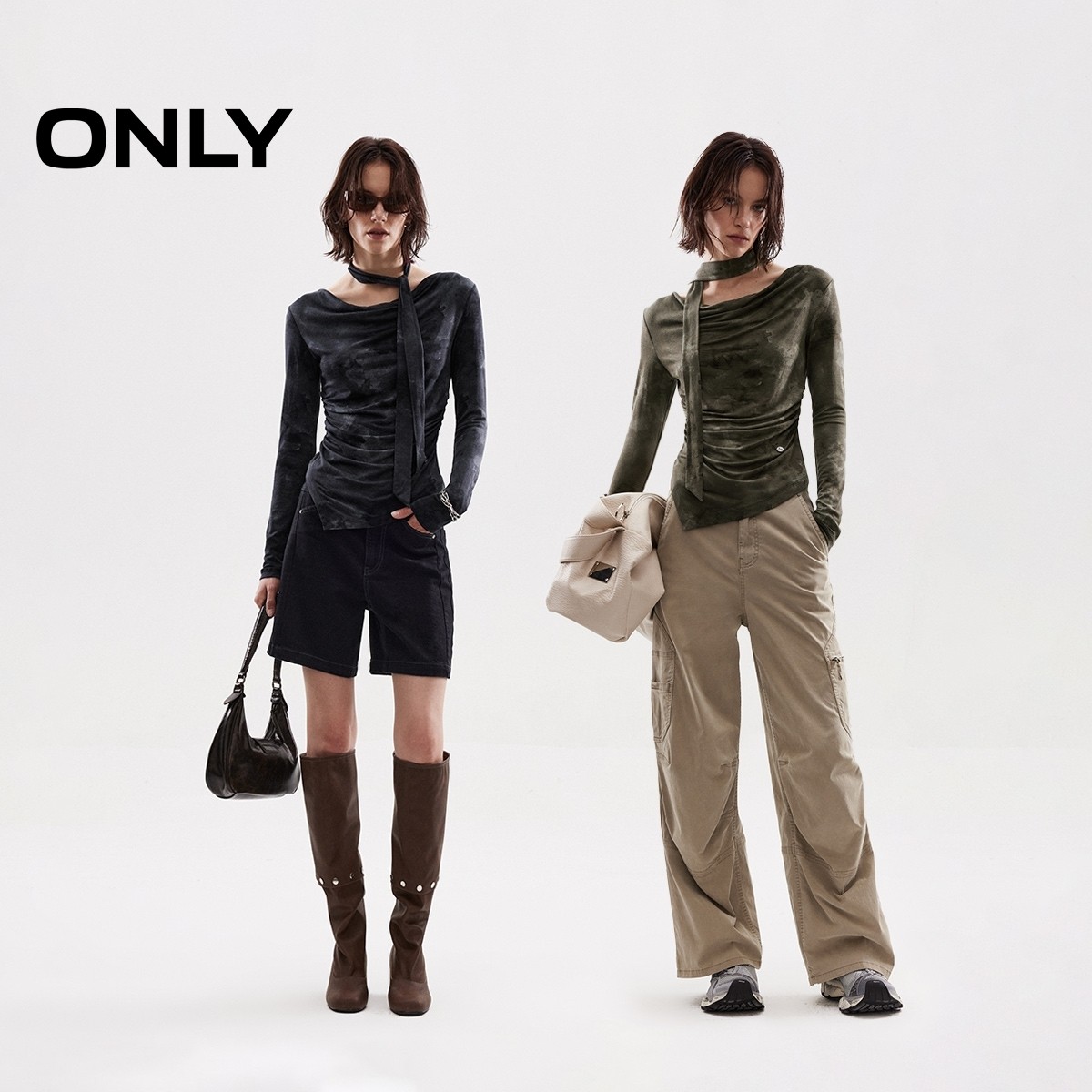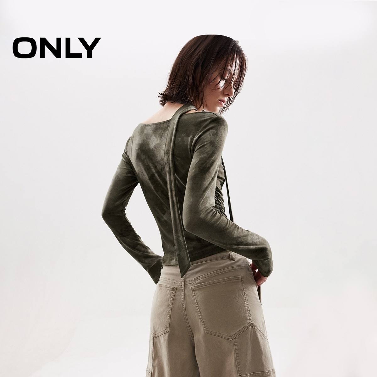 ONLY2025冬季新款优雅荡领个性修身纯色飘带腰身捏褶长袖T恤女