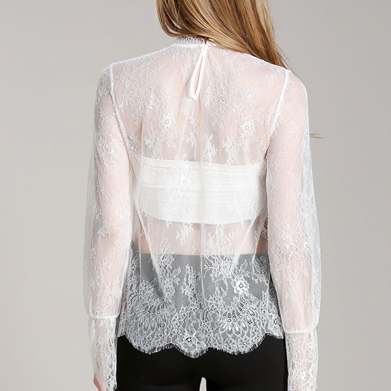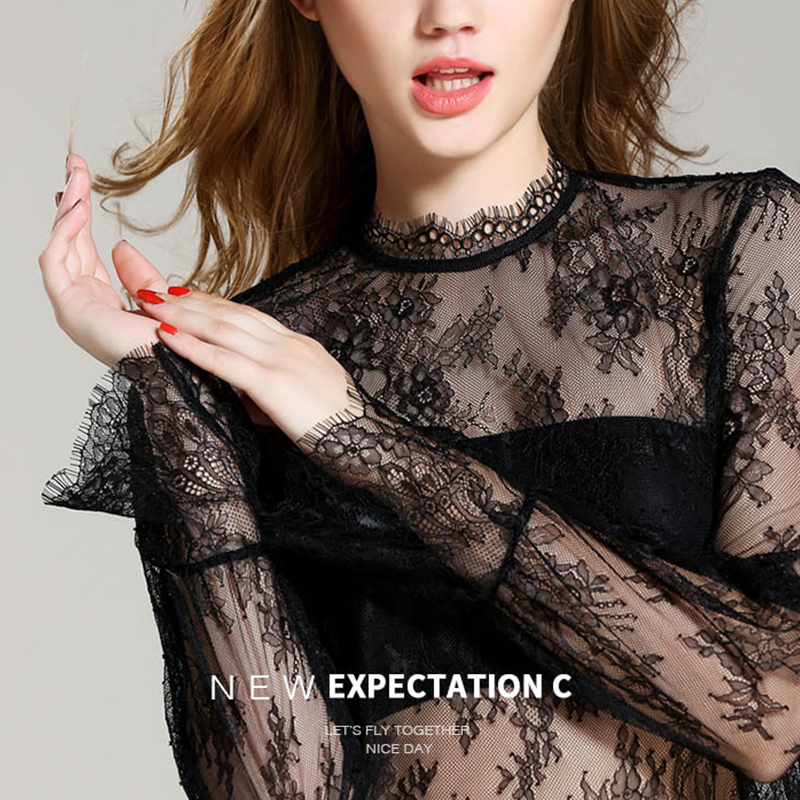 黑色透视立领蕾丝打底衫女秋冬洋气内搭纱衣性感喇叭袖网纱上衣薄