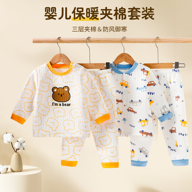 宝宝保暖衣套装纯棉护肚裤高腰男女婴儿夹棉秋衣三层内衣服秋装冬