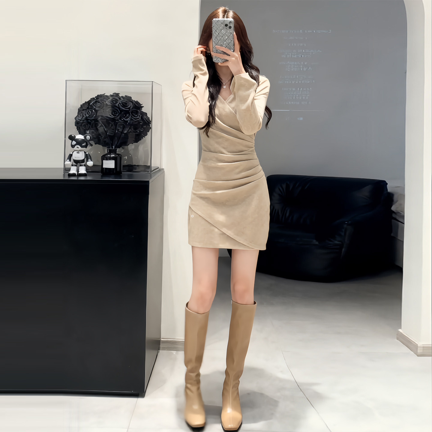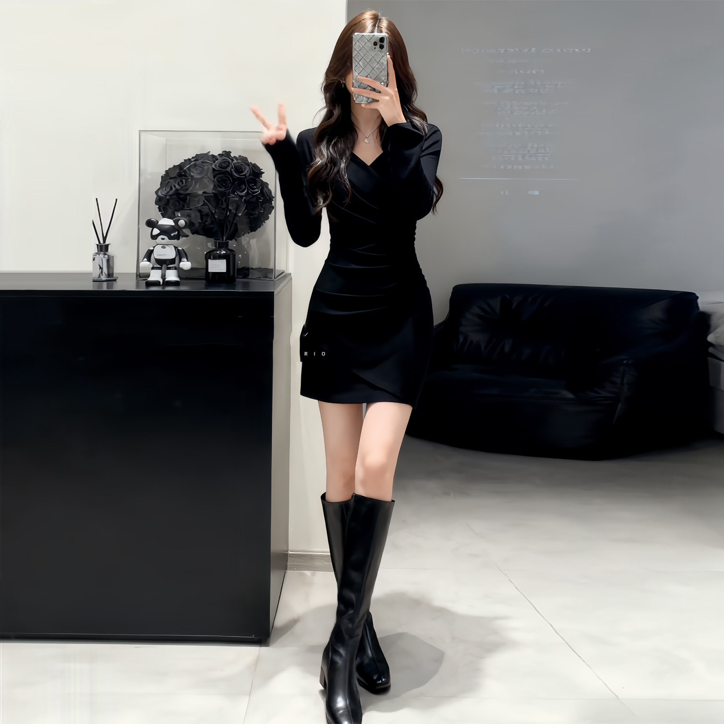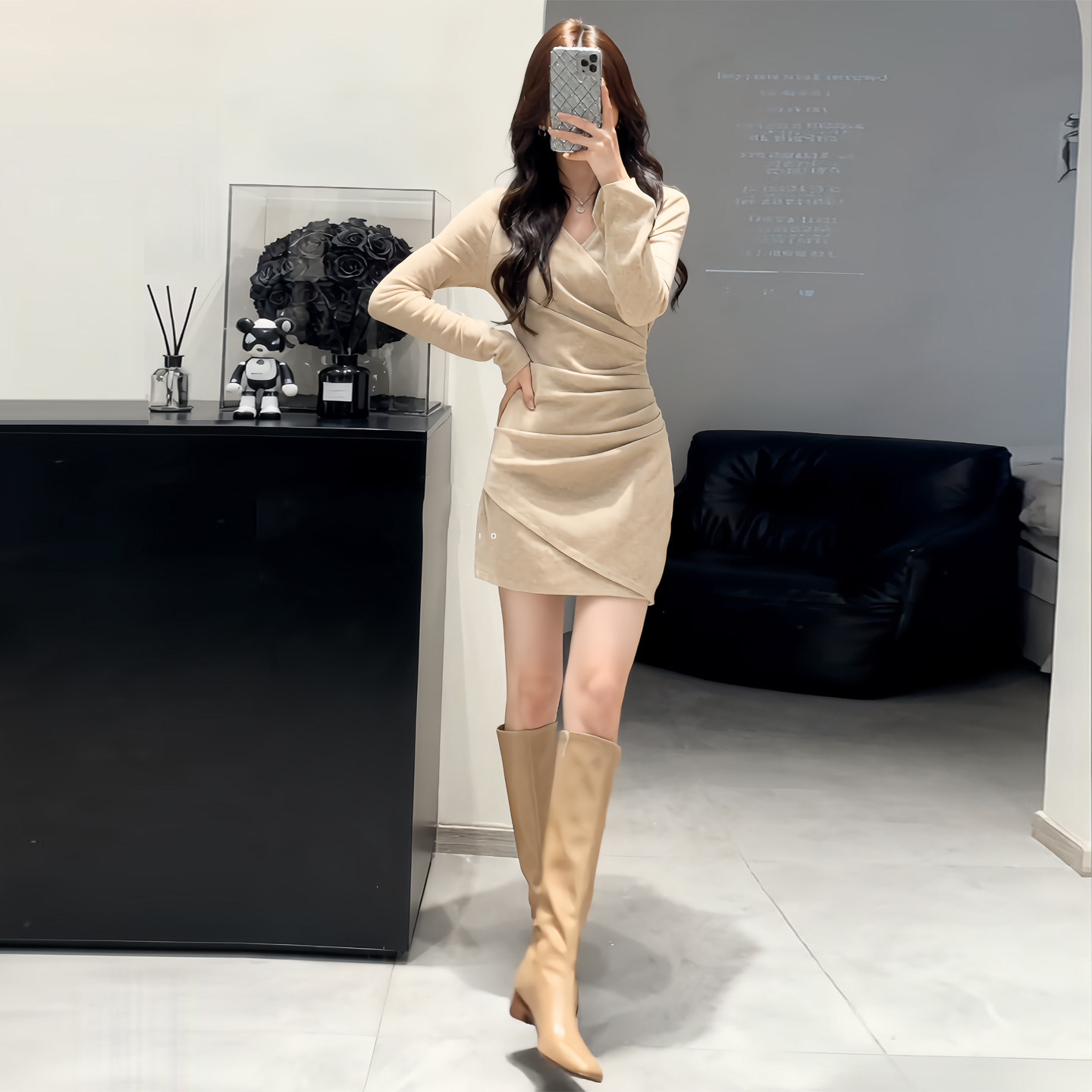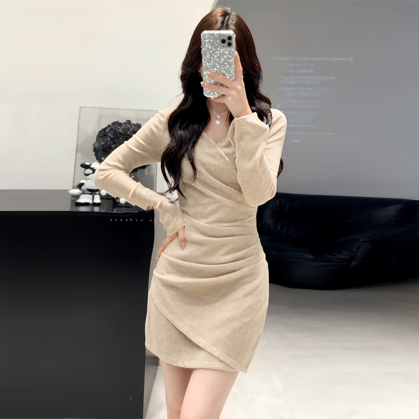 气质V领收腰针织连衣裙子女秋冬季配大衣修身显瘦包臀裙内搭短裙