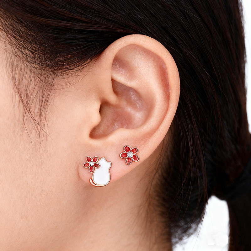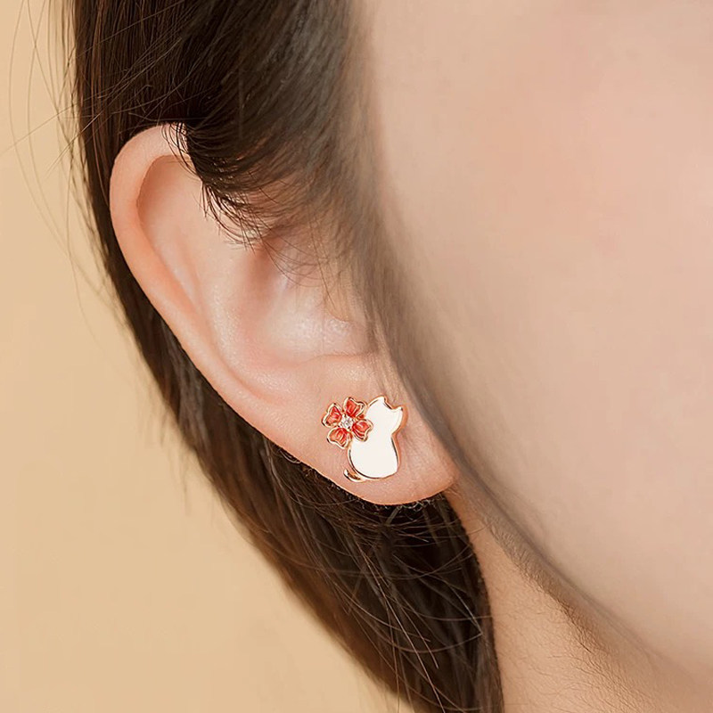 【花间小猫】可爱猫咪花朵不对称耳钉女小众设计感甜美气质小耳夹