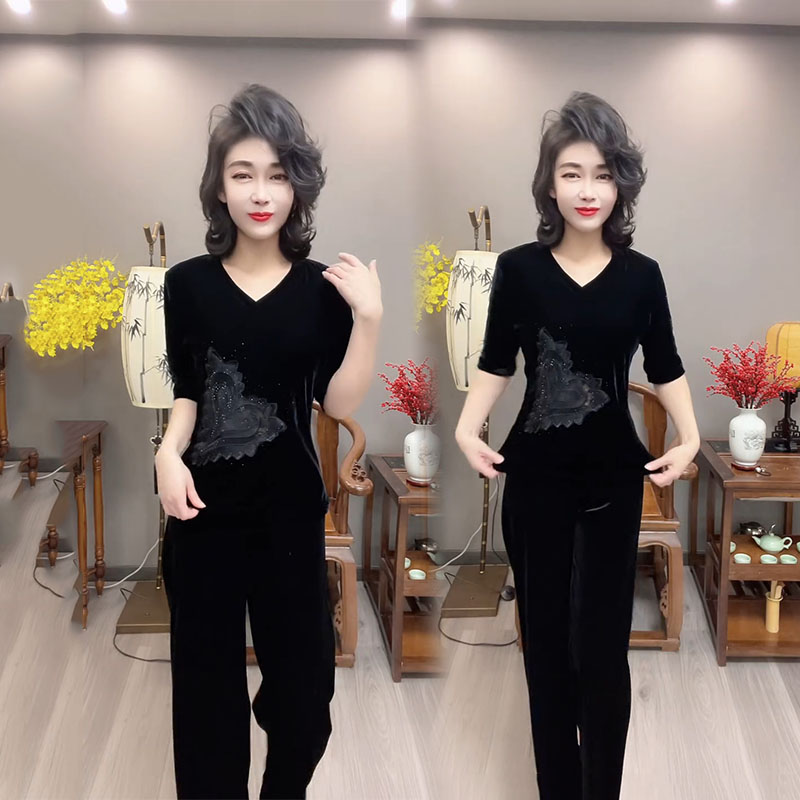 2025春季网红新款时尚套装女洋气桃心花V领丝绒短袖衫直筒裤两件