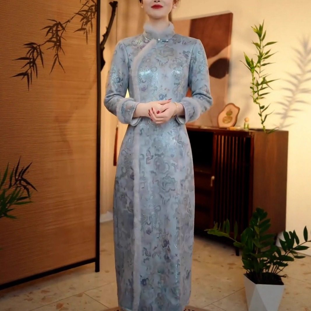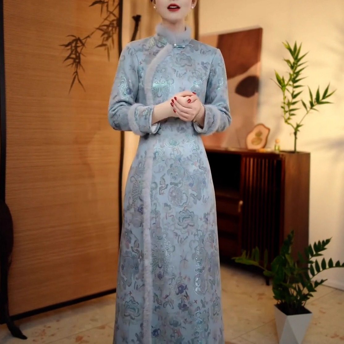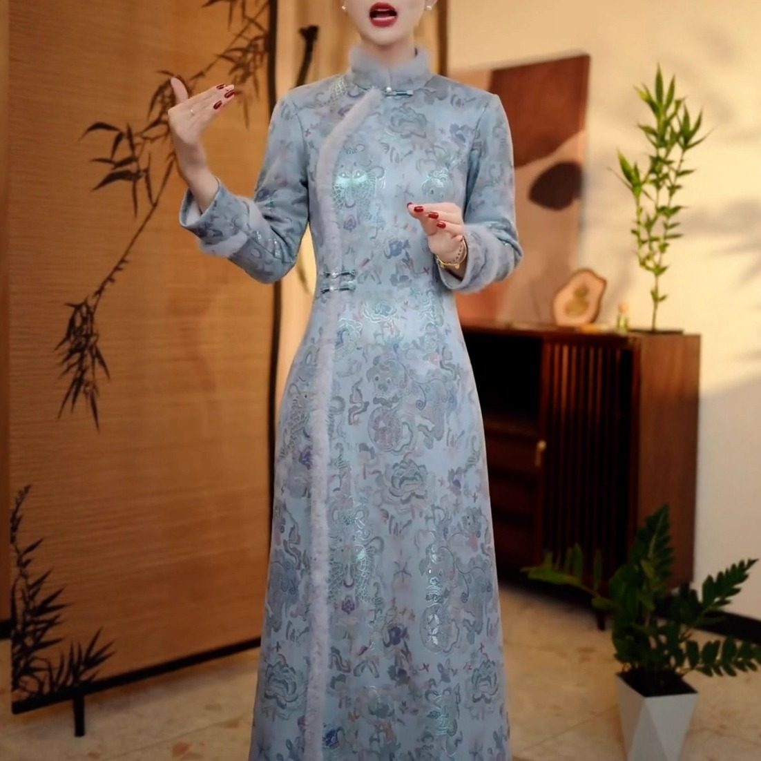 秋冬新款高端加绒加厚新中式国风复古重工提花改良旗袍气质连衣裙