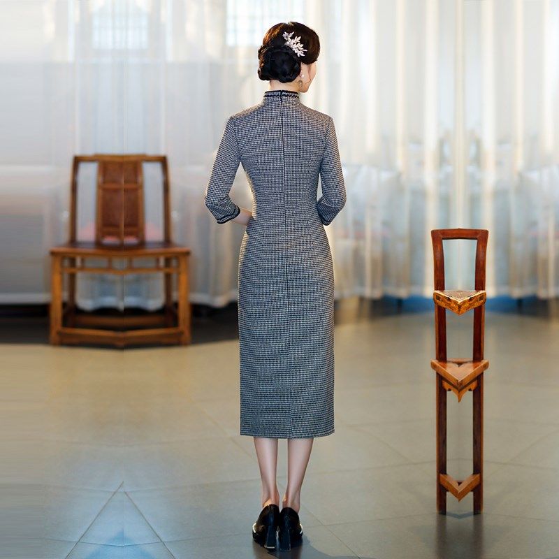格子旗袍秋冬长袖保暖女装气质棉绒连衣裙中老年妈妈日常礼服大码