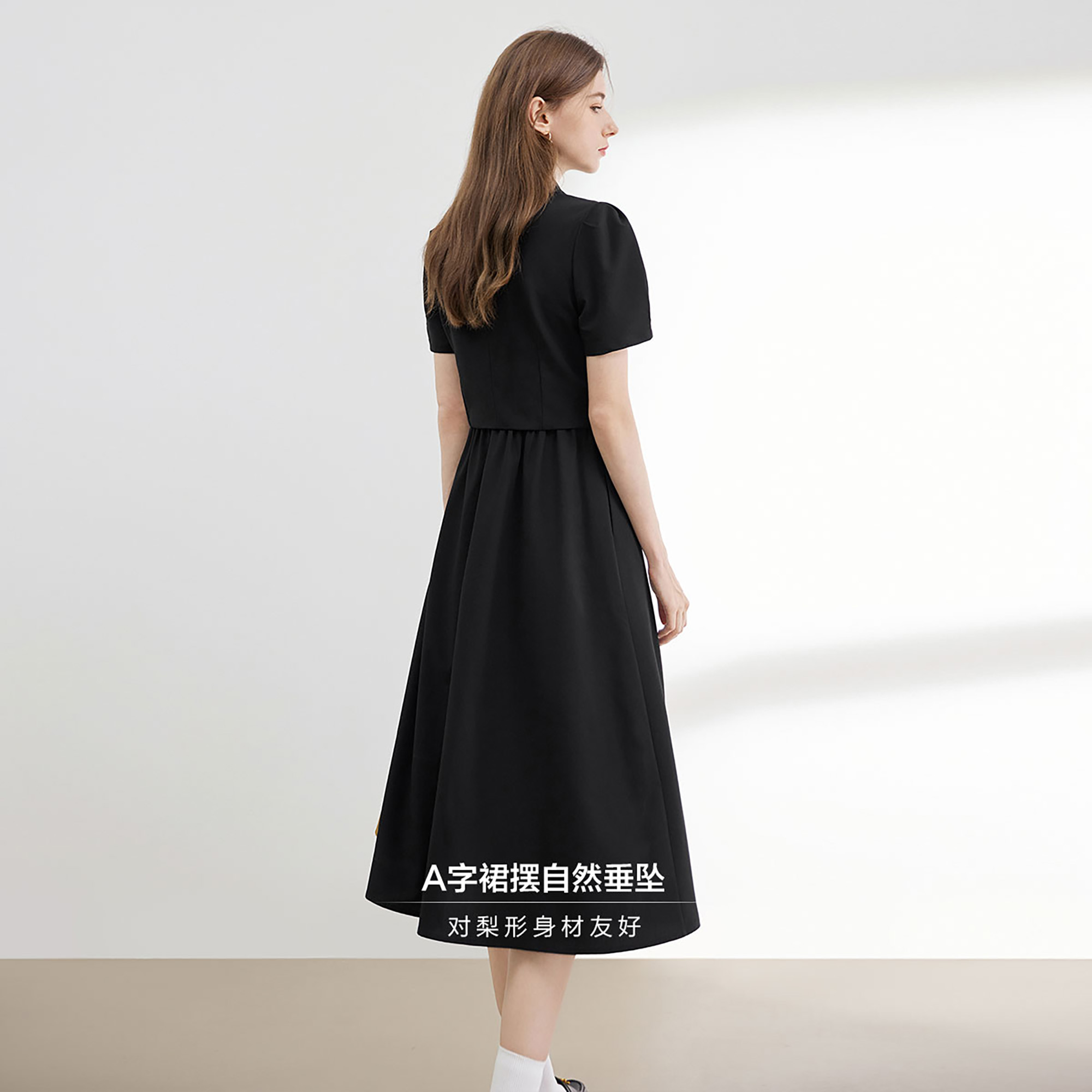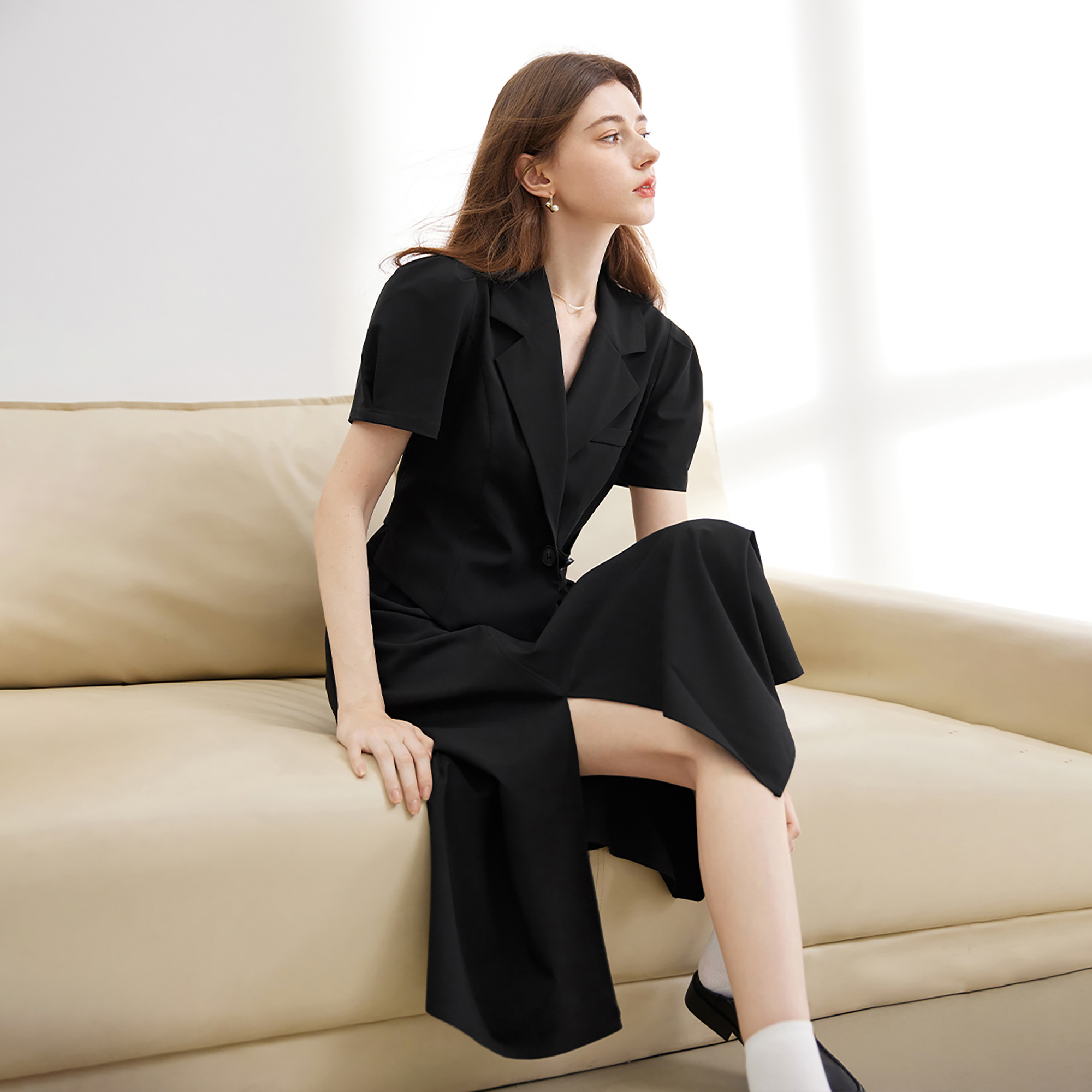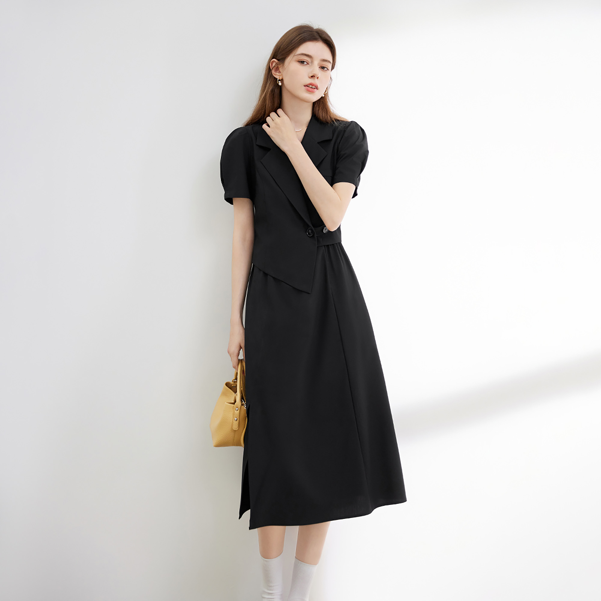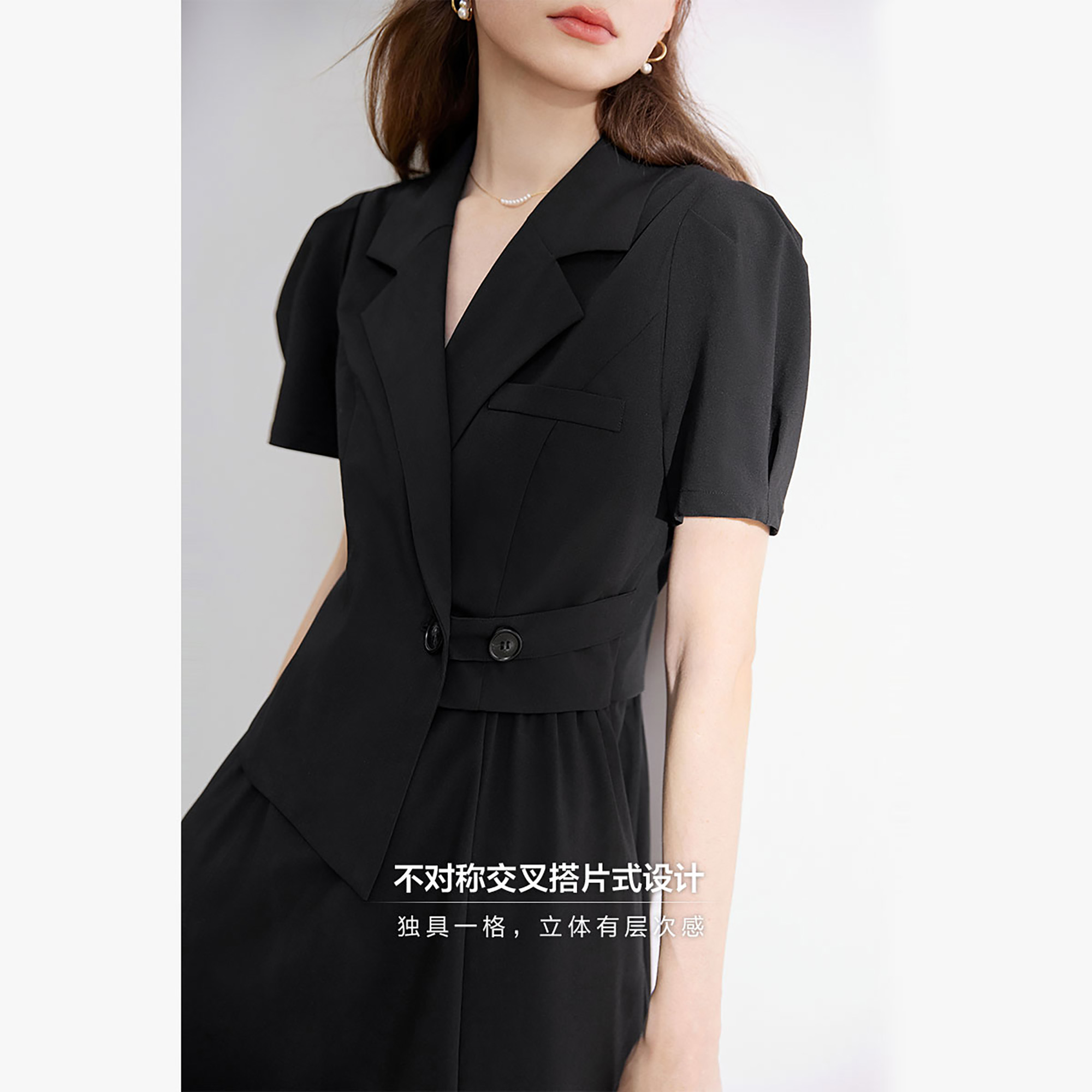MEETLADY假两件西装领连衣裙女夏季新款高腰显瘦气质修身小黑裙子