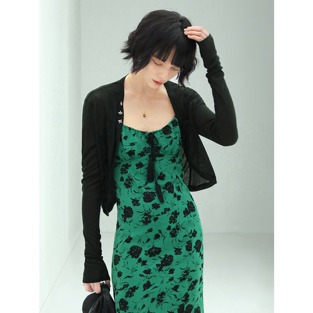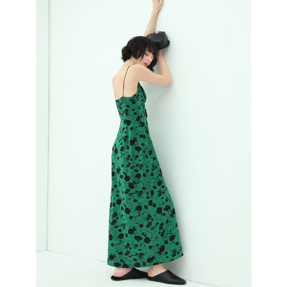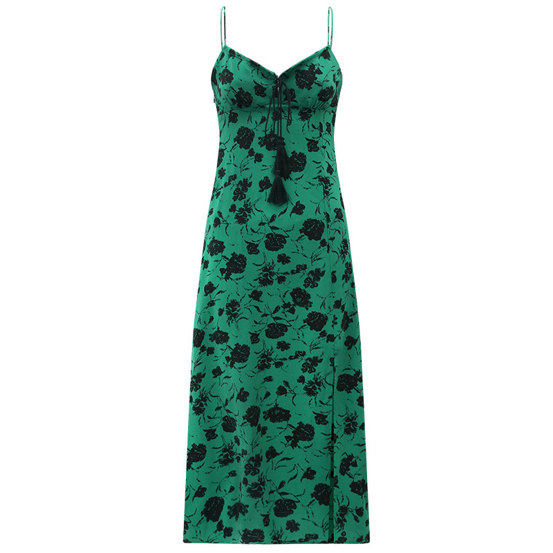 [爆款直降]COCOBELLA流苏飘带碎花吊带裙侧开叉缎面连衣裙FR150