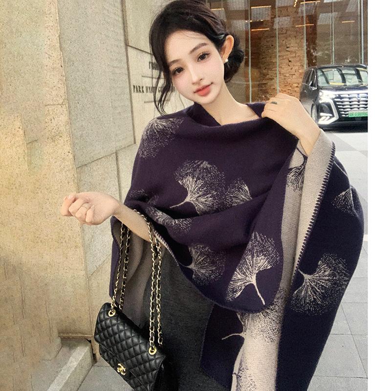 银杏叶披肩秋冬季保暖围巾暗黑开叉斗篷旅游民族风外搭加厚披风女