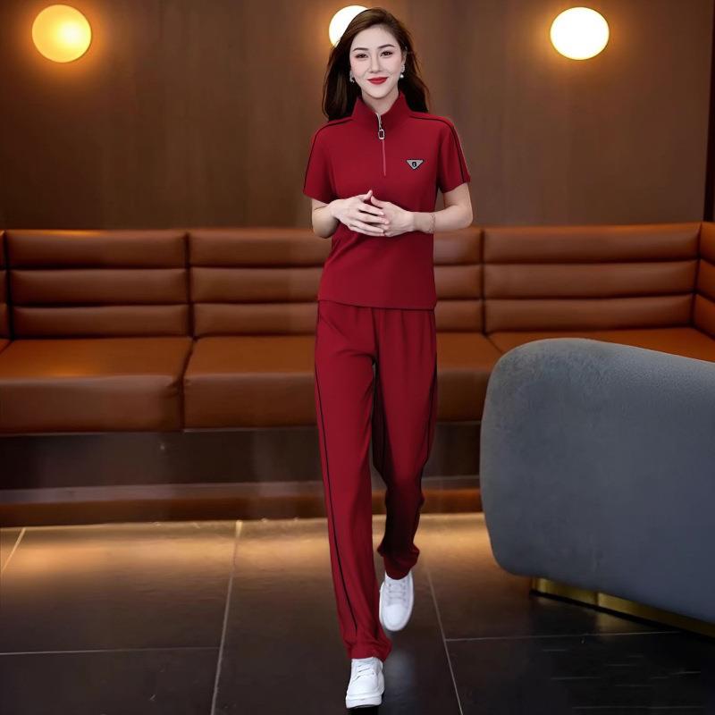 红色运动休闲套装女夏季宽松时尚减龄户外穿搭短袖阔腿裤两件套潮