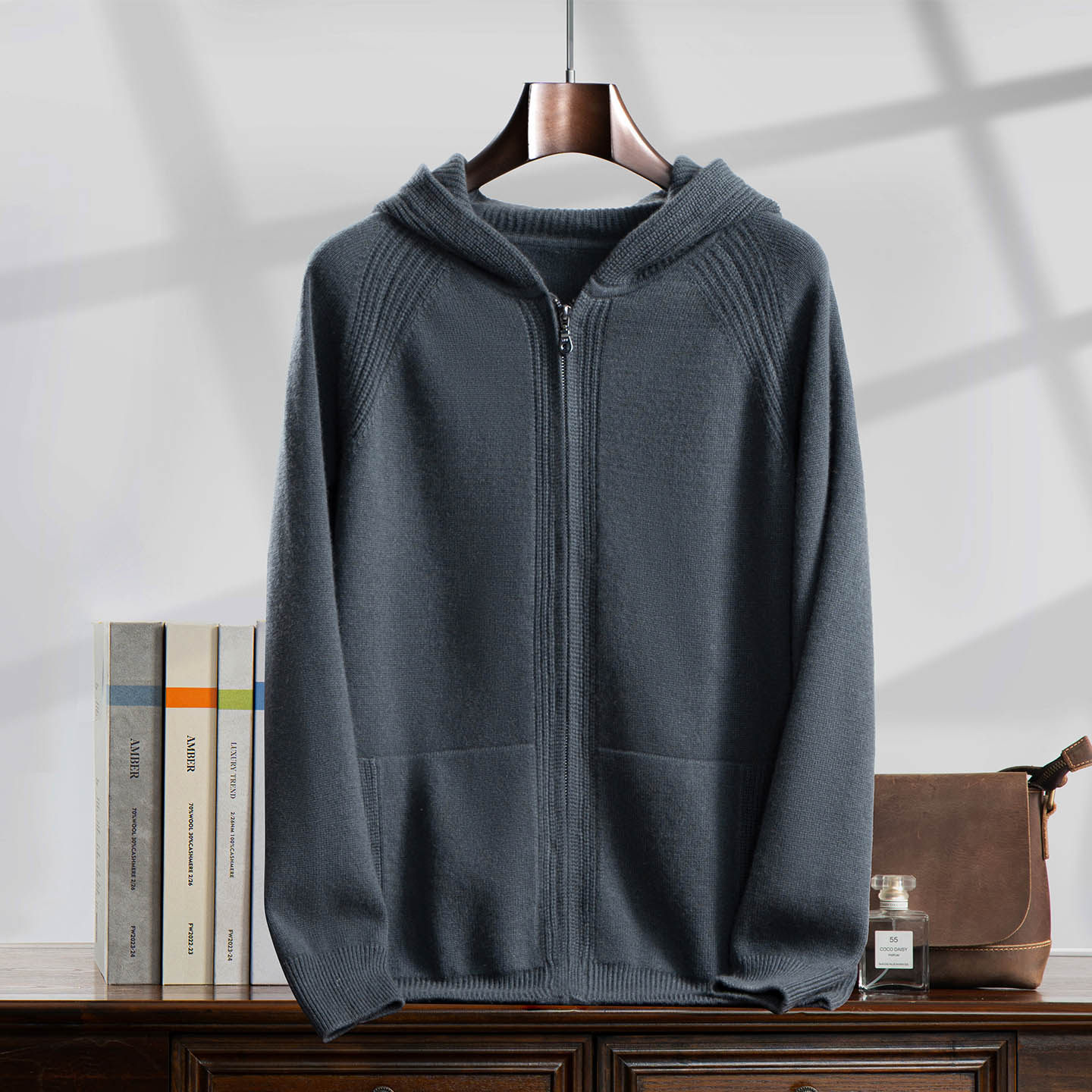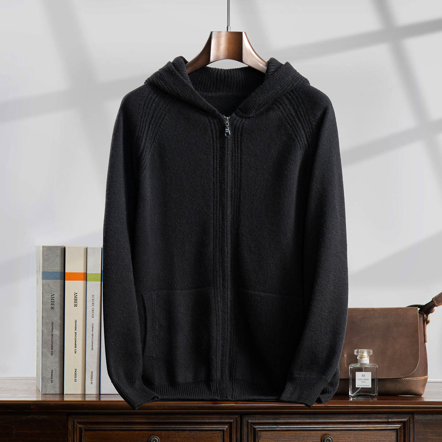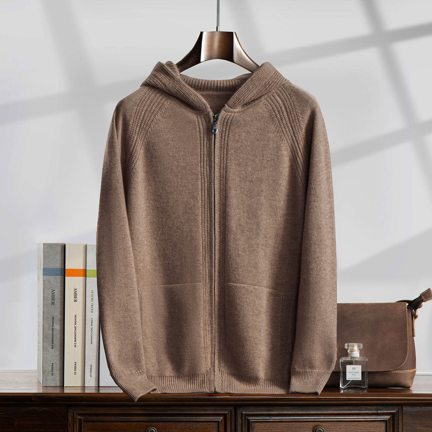 高品质男款重磅加厚拉链连帽100%山羊绒开衫针织商务休闲外套上衣