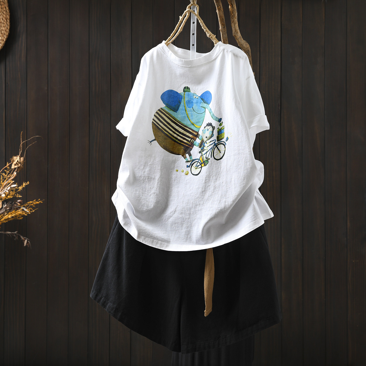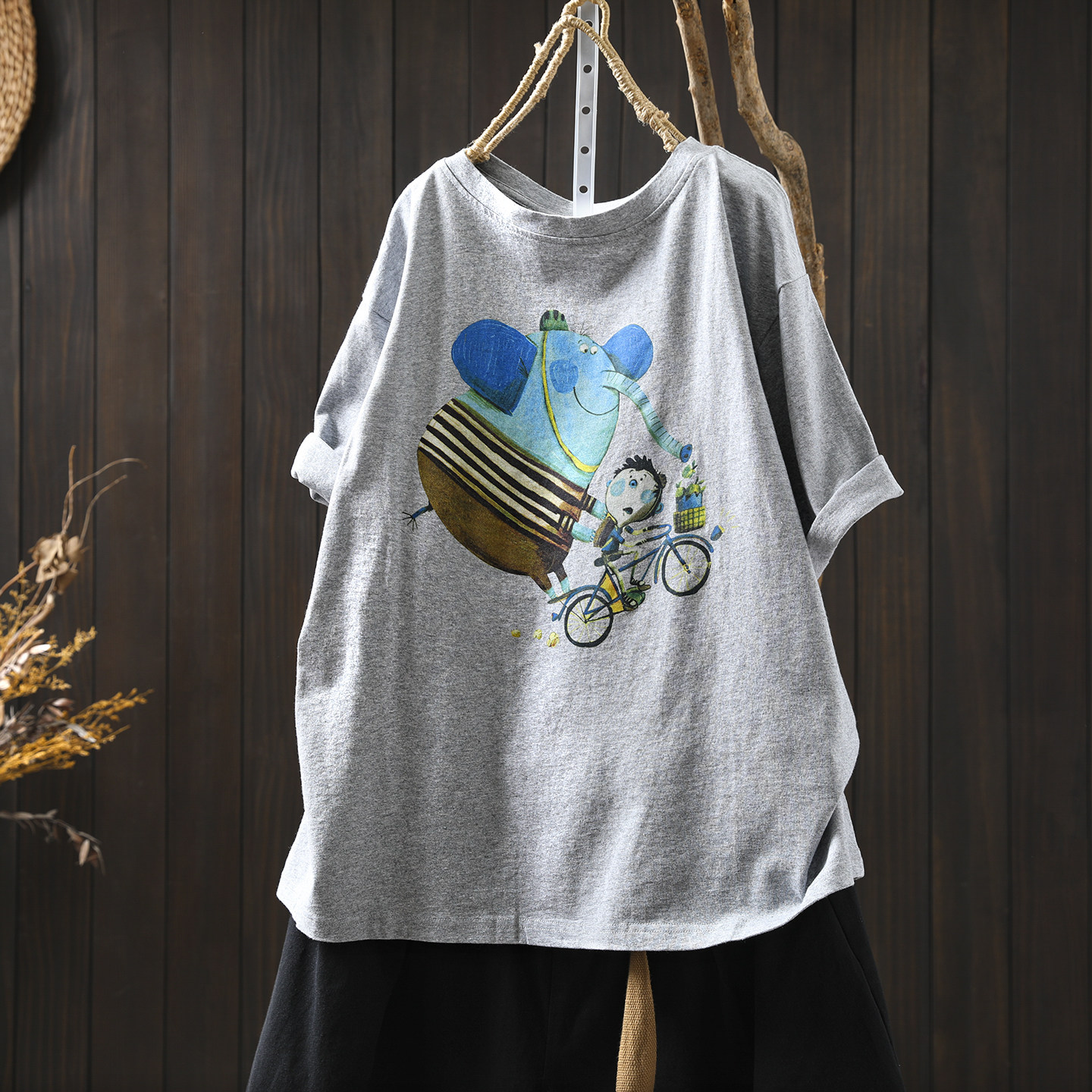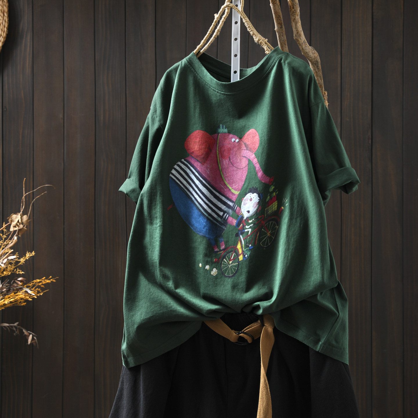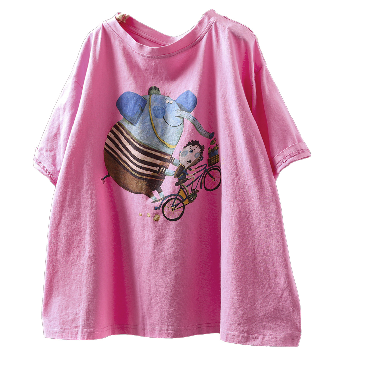 大象印花粉色纯棉短袖女t恤夏2025新款韩版宽松大码显瘦减龄上衣