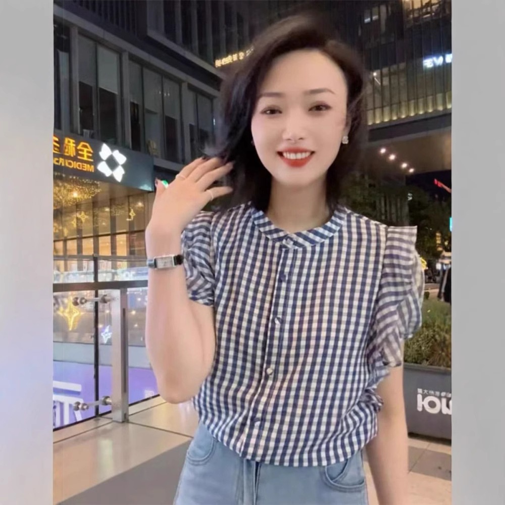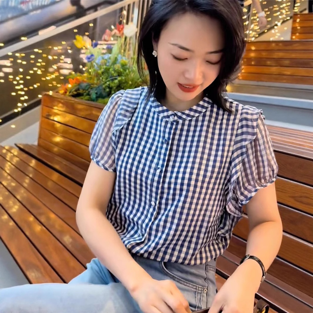 设计感荷叶边短袖衬衫女装夏季新款宽松百搭显瘦衬衣别致条纹